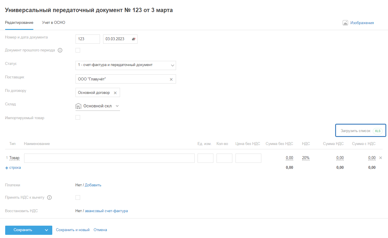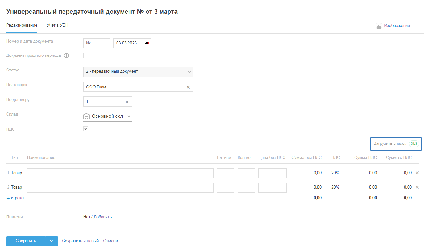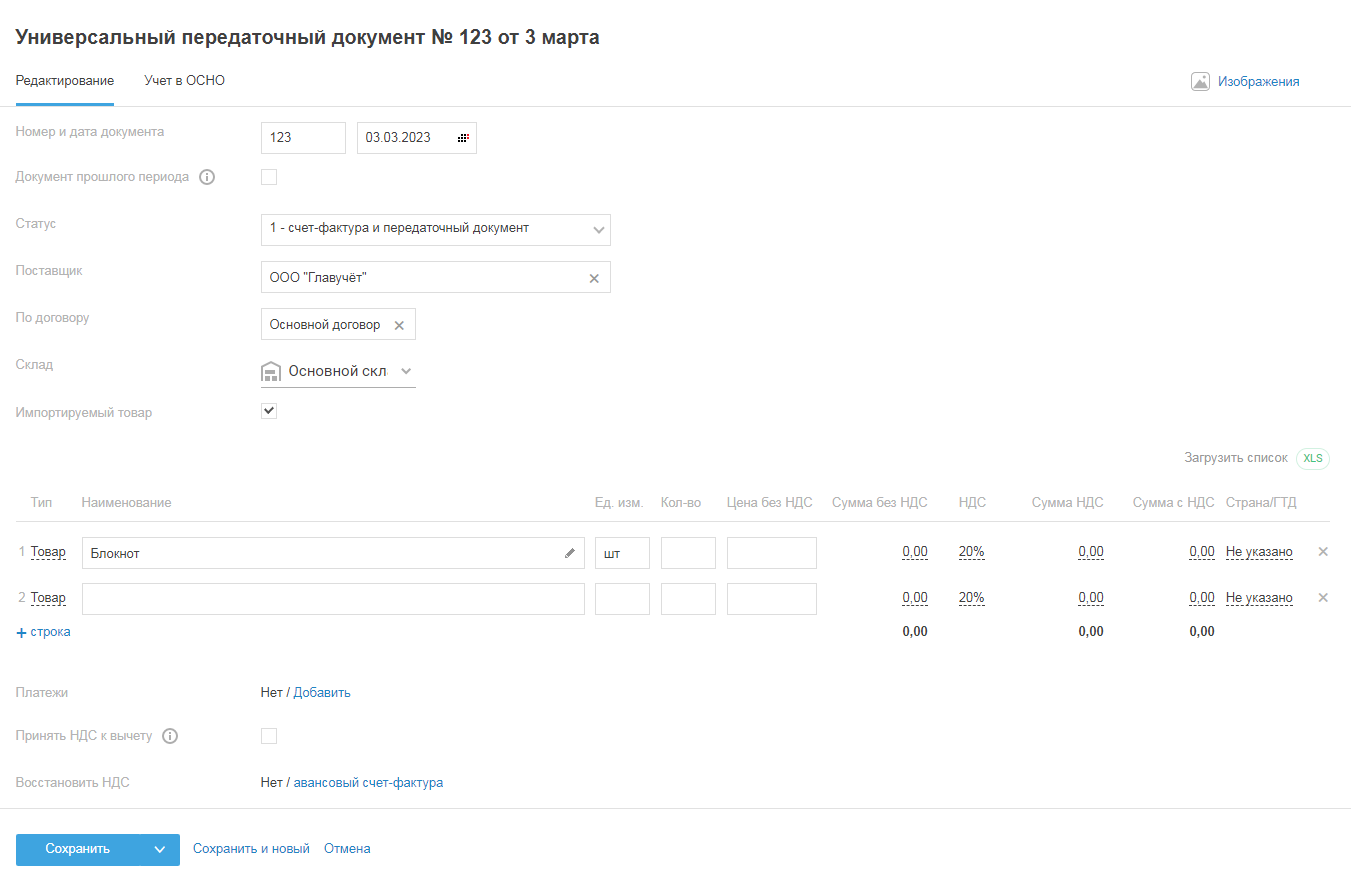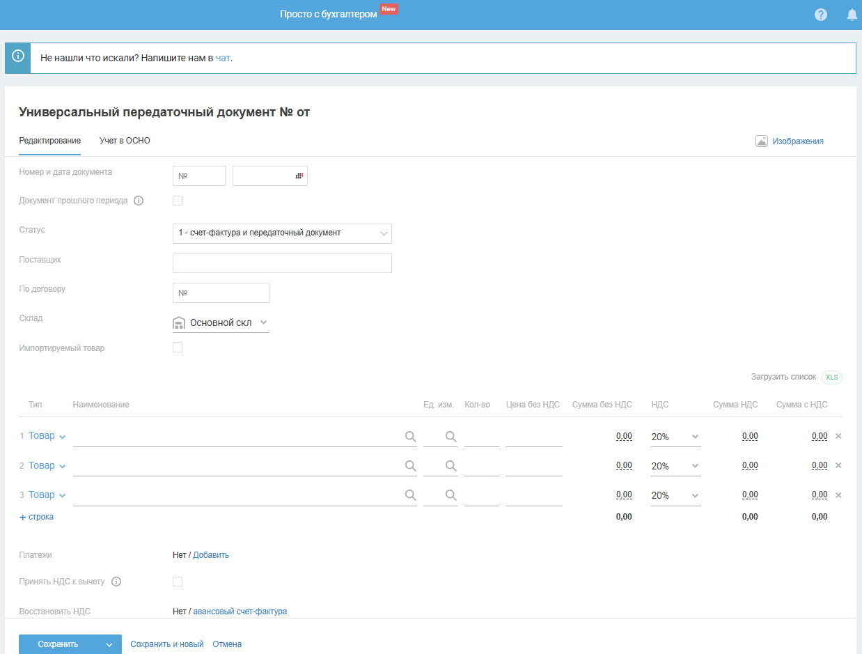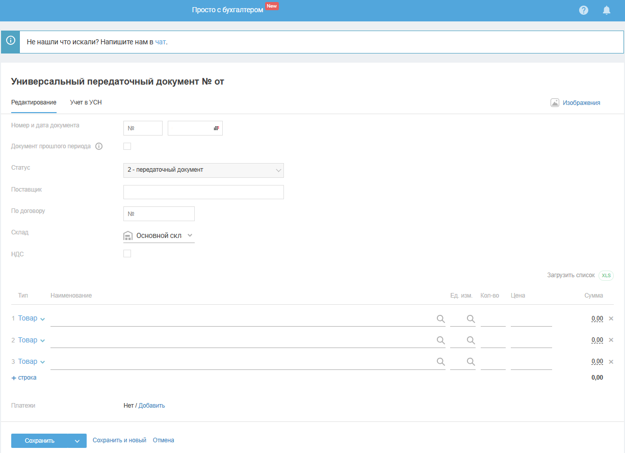 - Сохранить и создать новый — загрузится форма для создания нового УПД