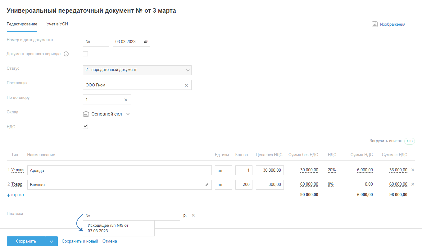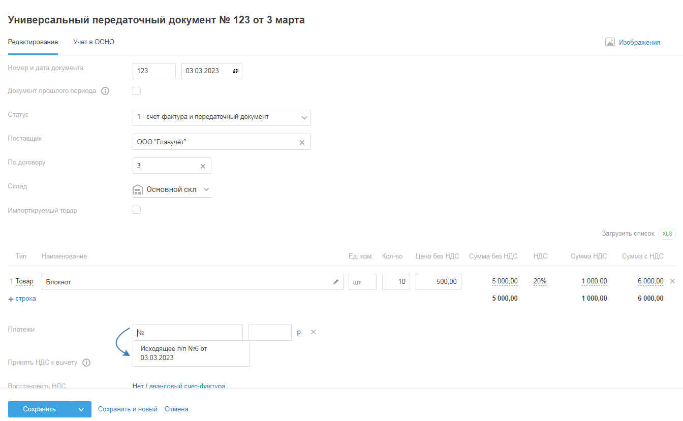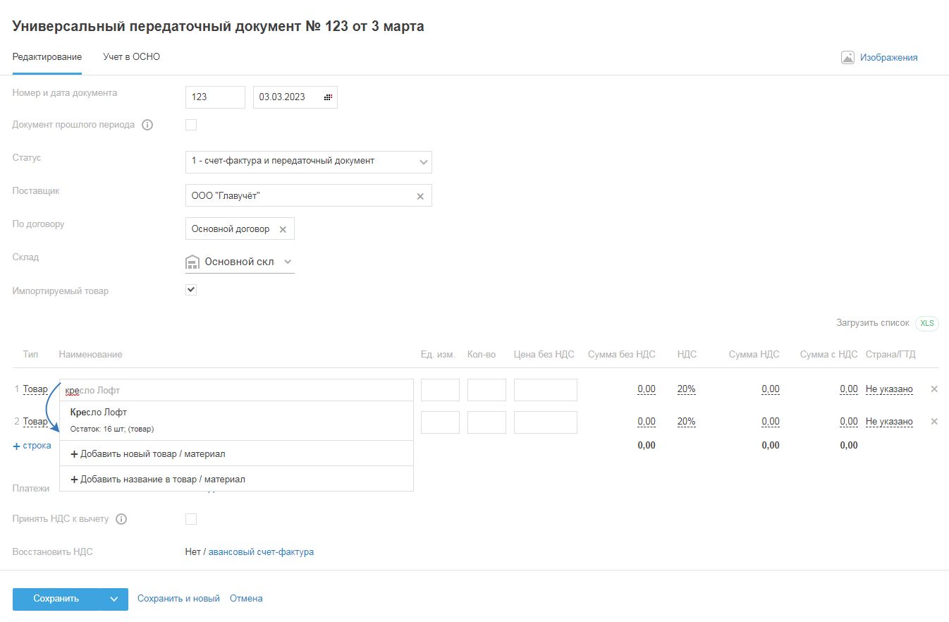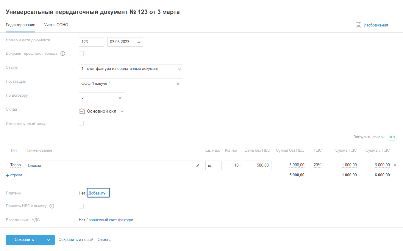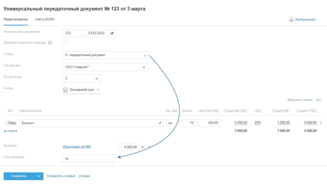 - Сохранить и создать новый — загрузится форма для создания нового УПД