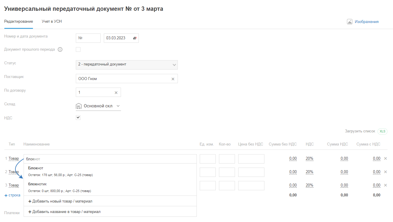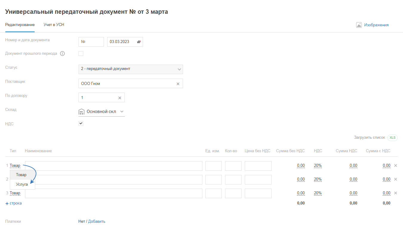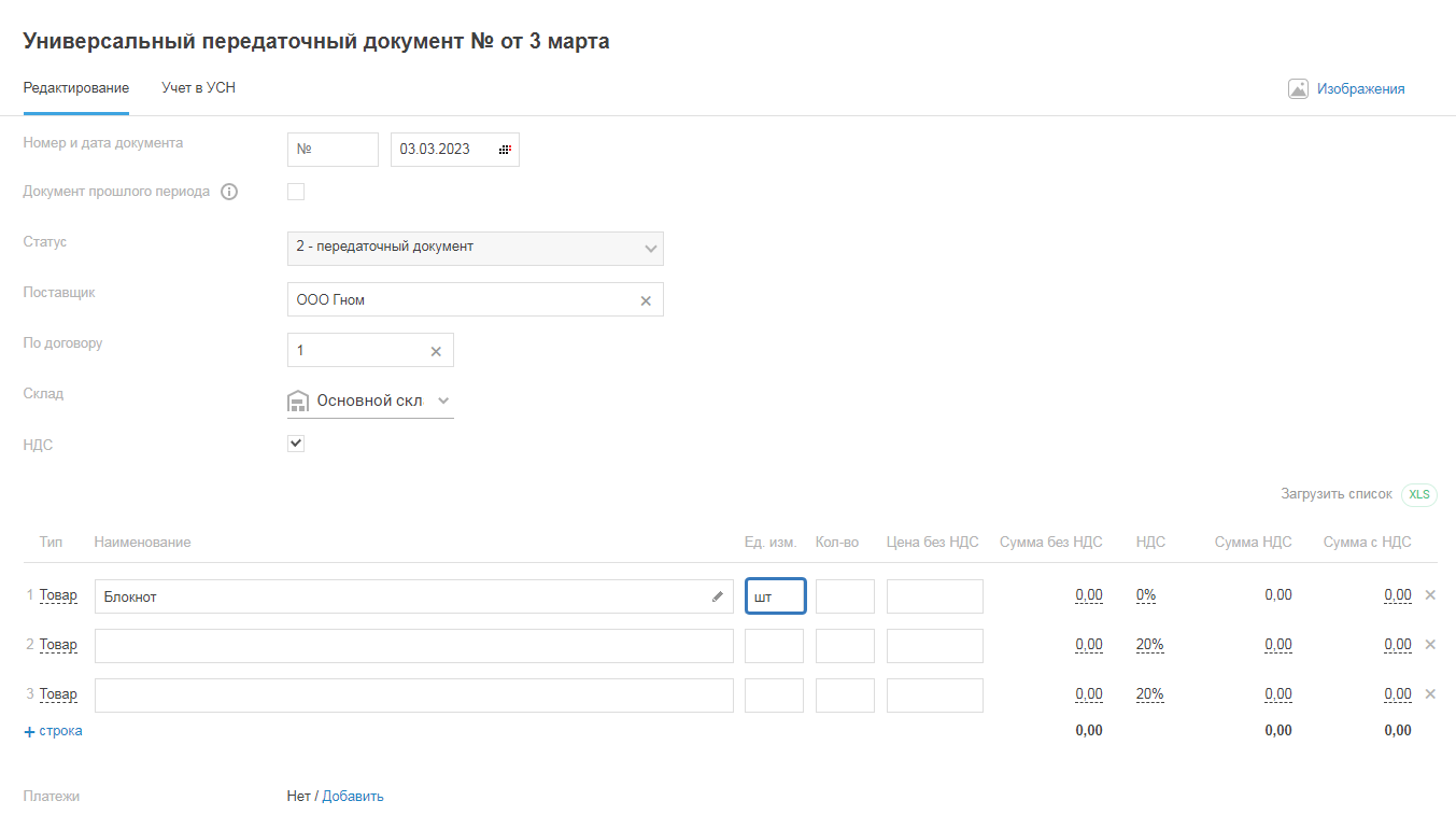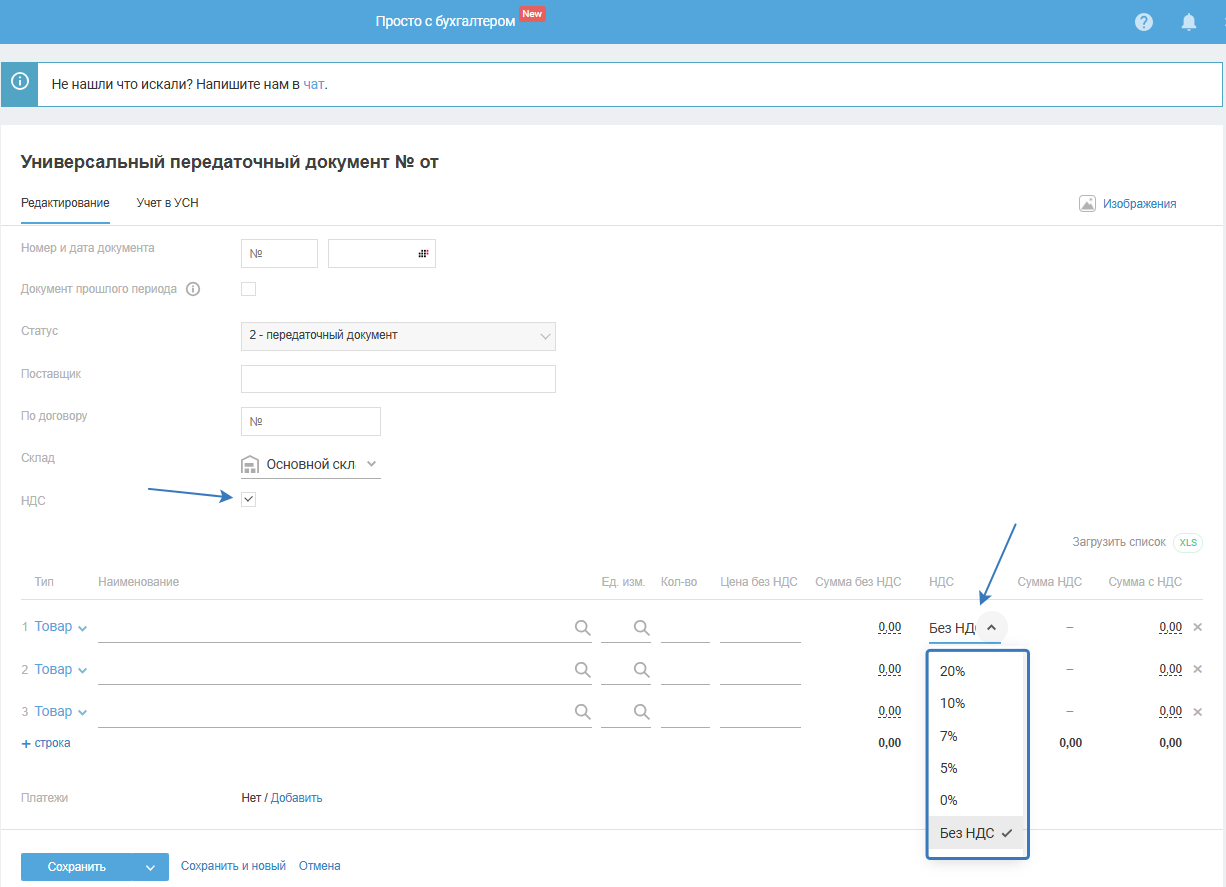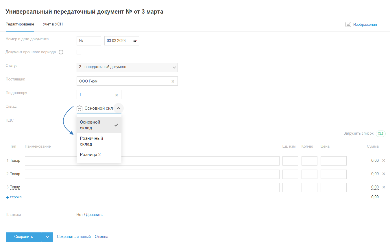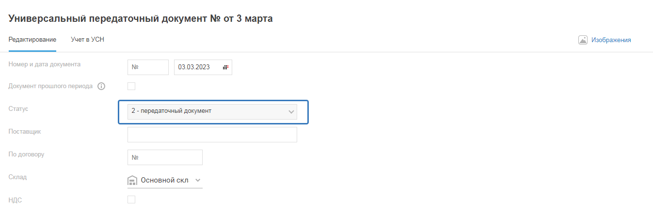 - Сохранить и создать новый — загрузится форма для создания нового УПД