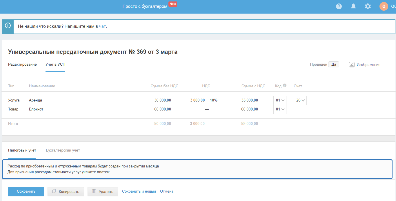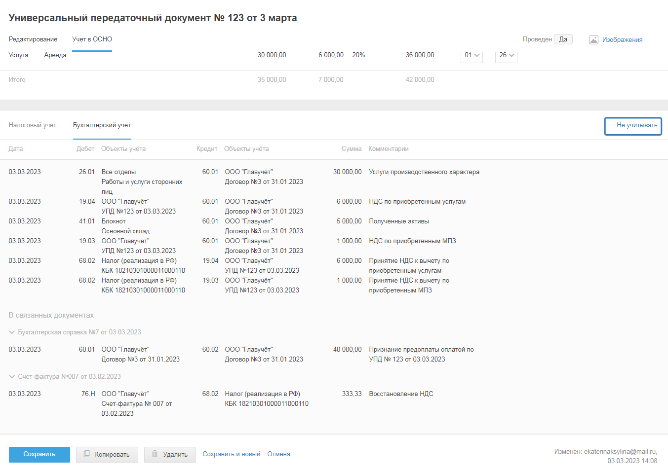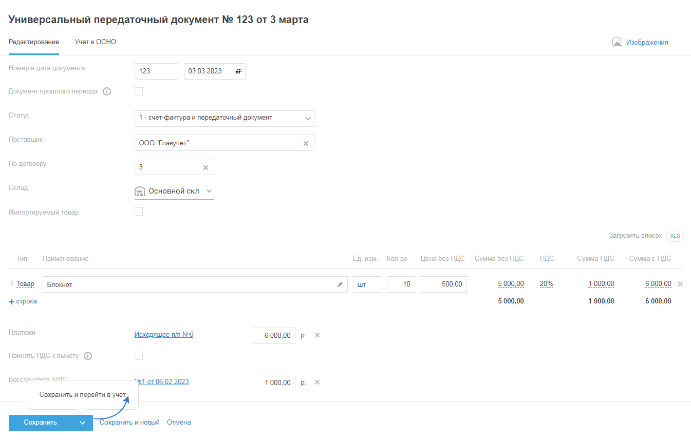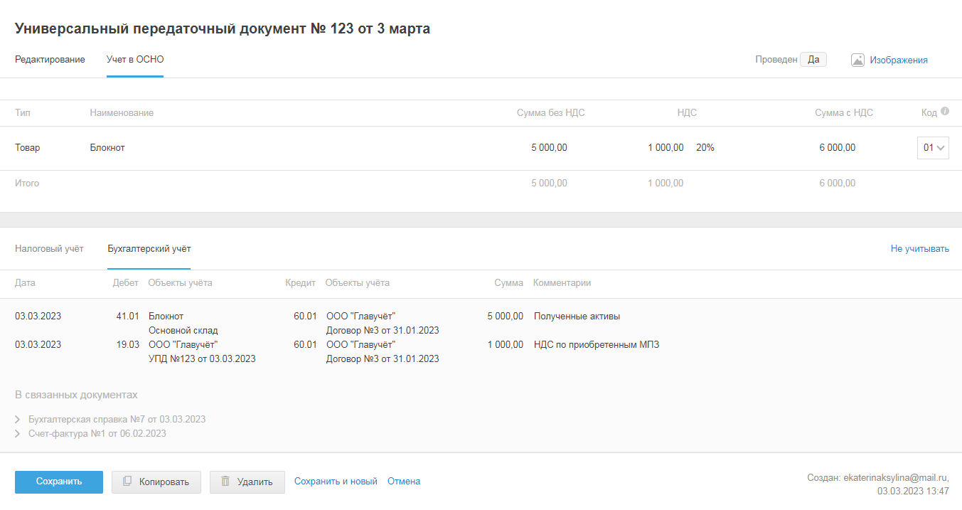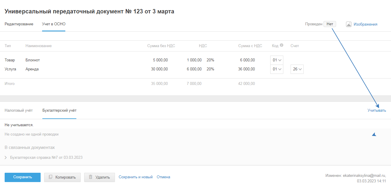 - Сохранить и перейти в учёт — чтобы перейти в режим учёта и посмотреть как УПД проведён в бухгалтерском и налоговом учётах.