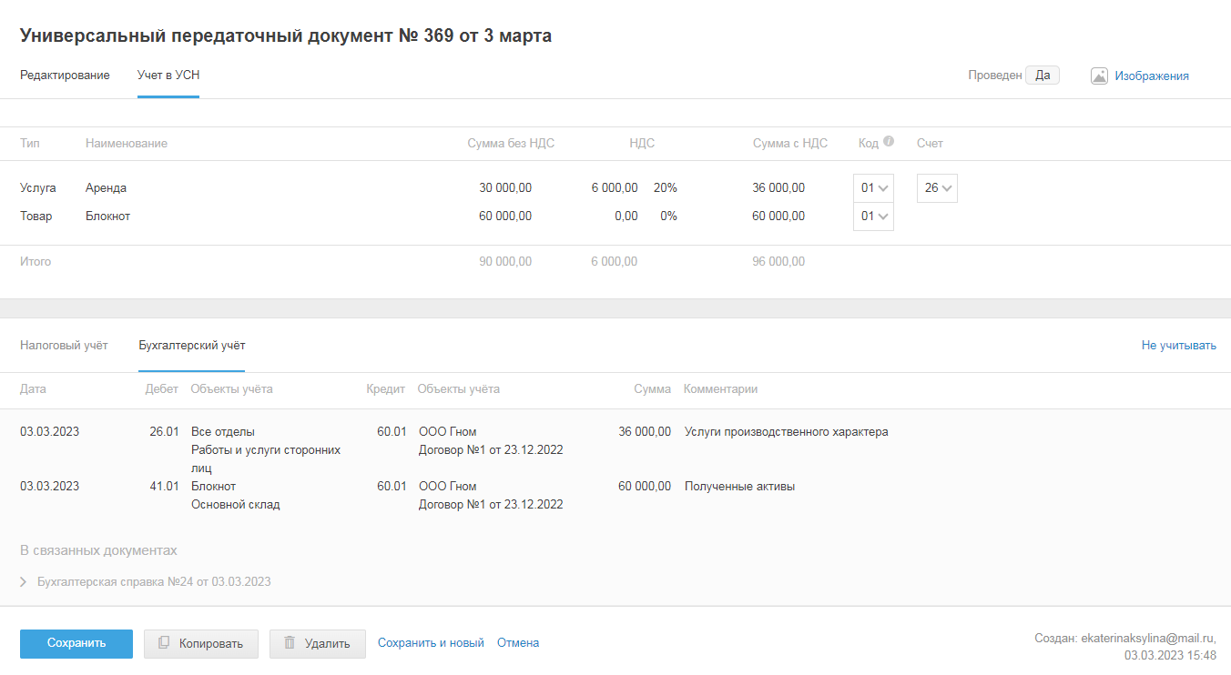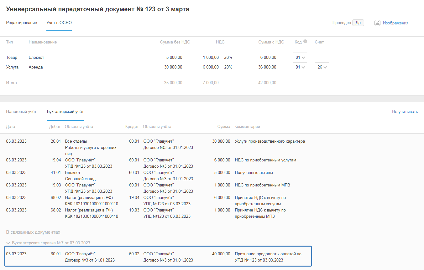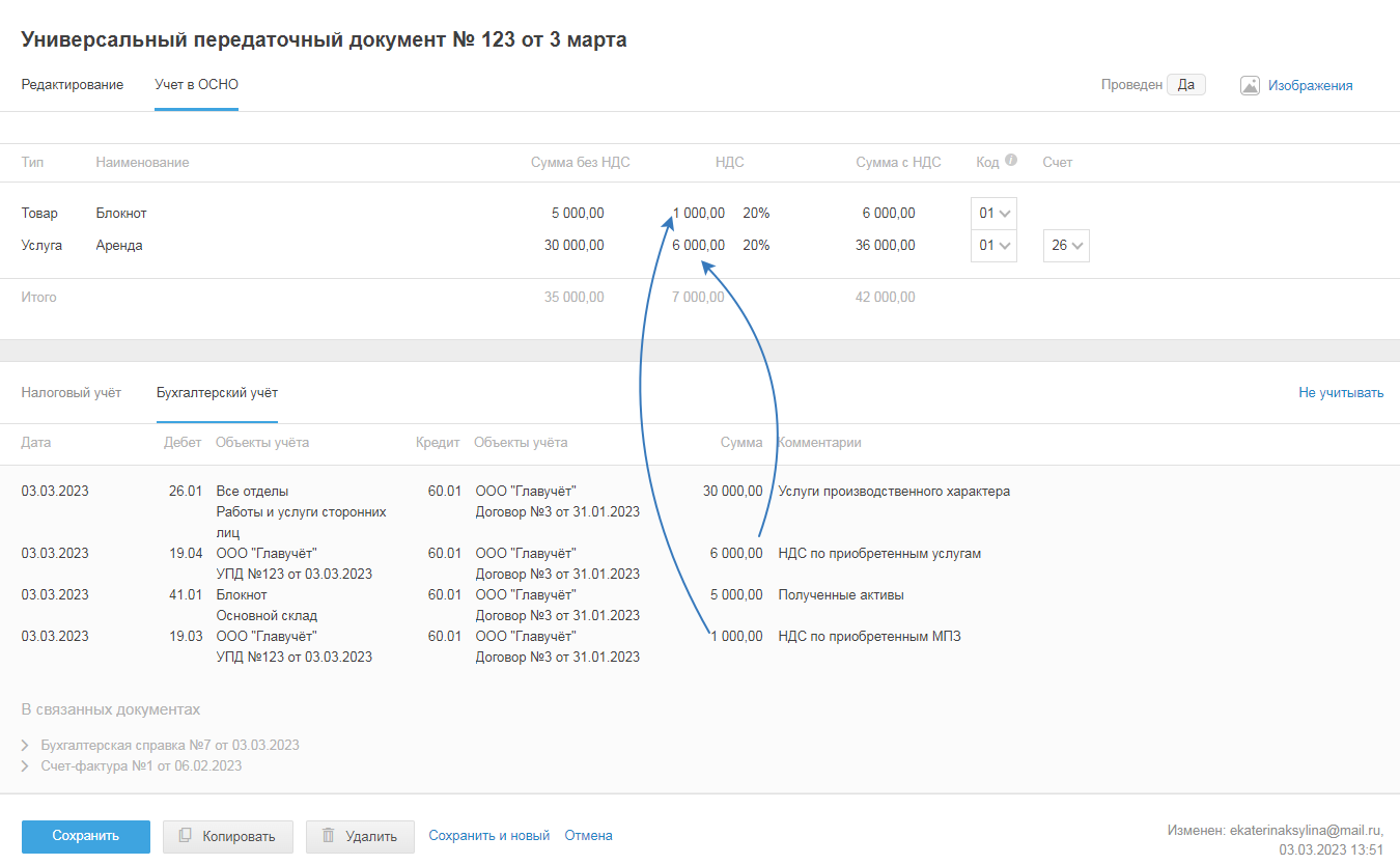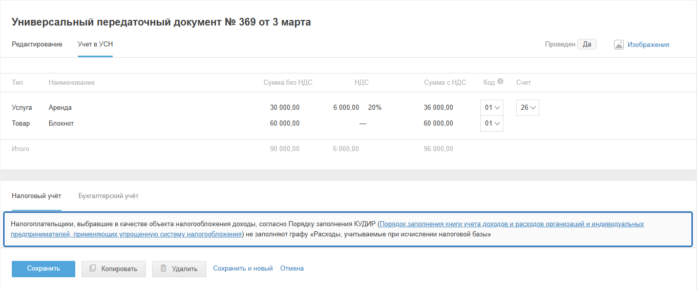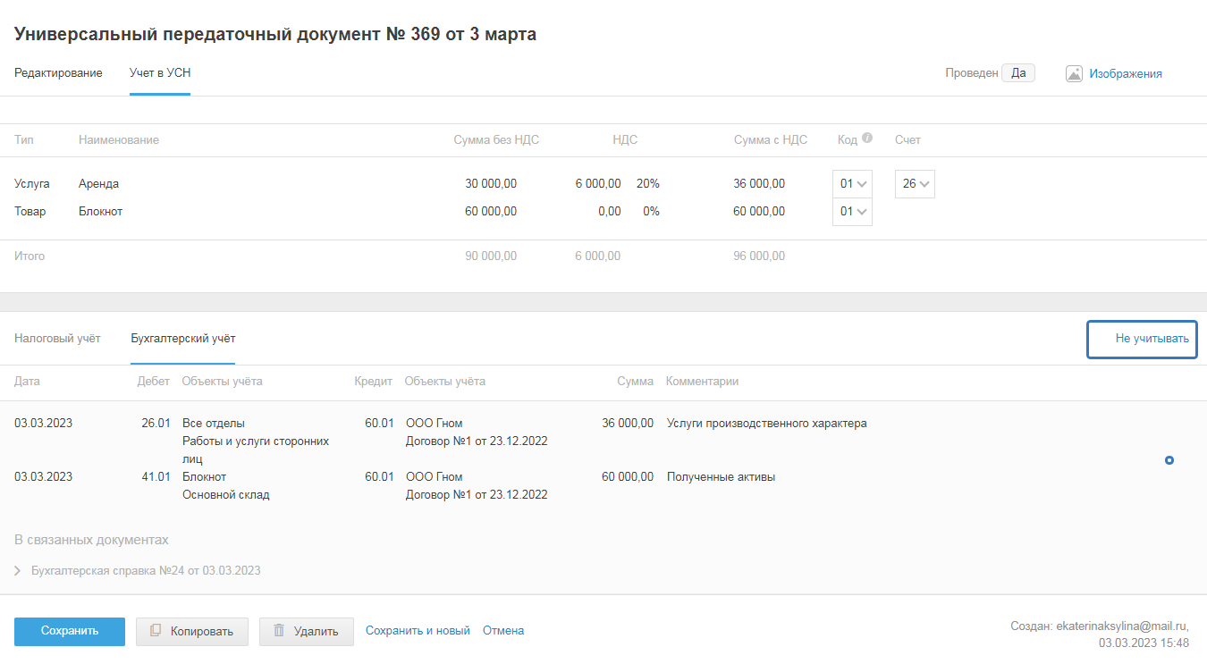- Сохранить и перейти в учёт — чтобы перейти в режим учёта и посмотреть как УПД проведён в бухгалтерском и налоговом учётах.