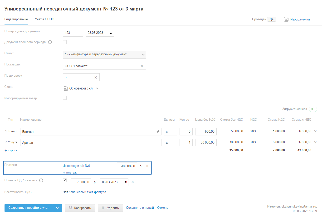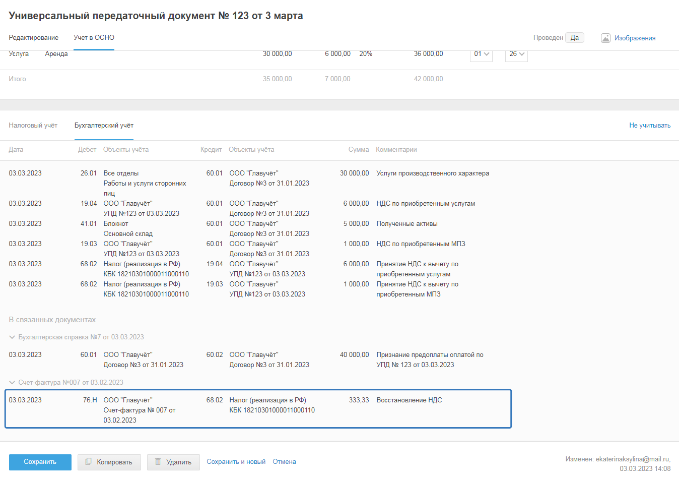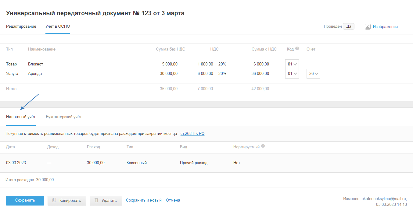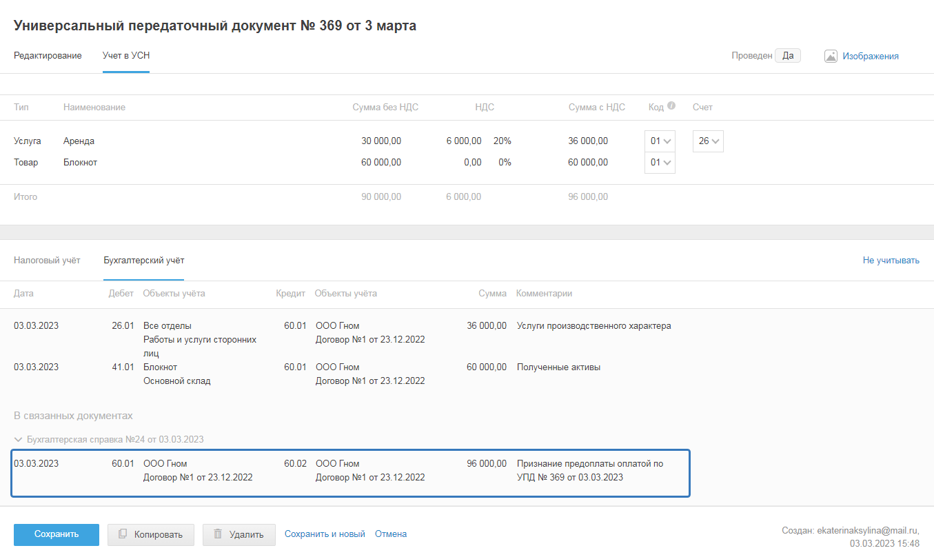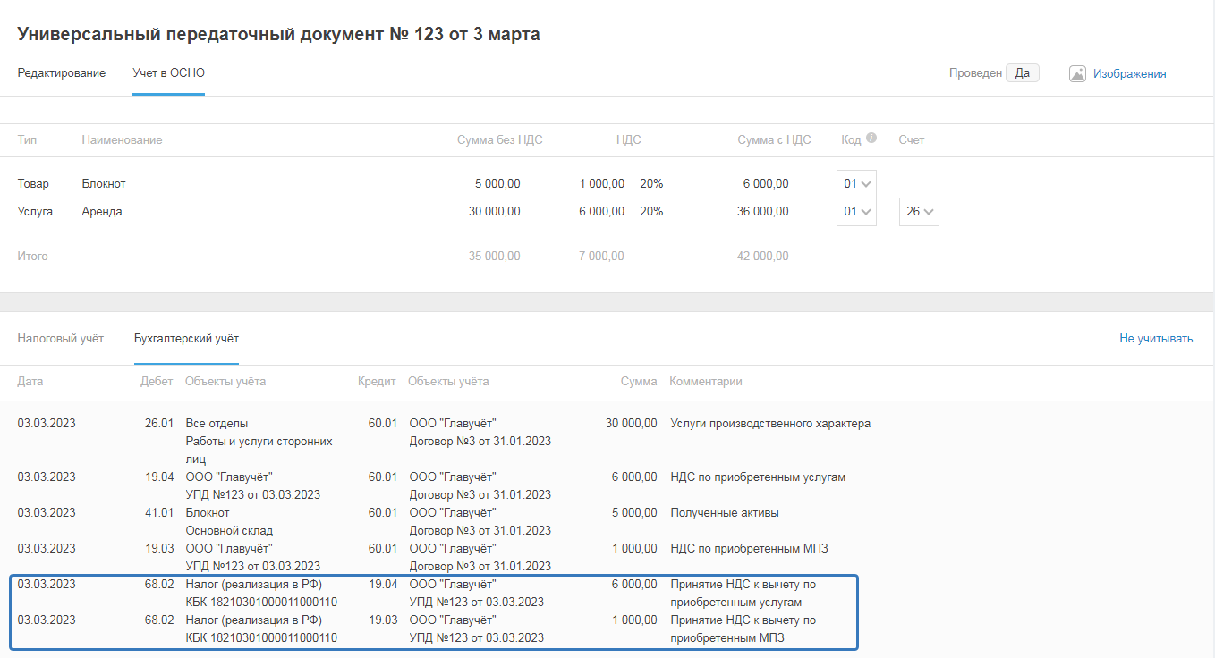 - Сохранить и перейти в учёт — чтобы перейти в режим учёта и посмотреть как УПД проведён в бухгалтерском и налоговом учётах.