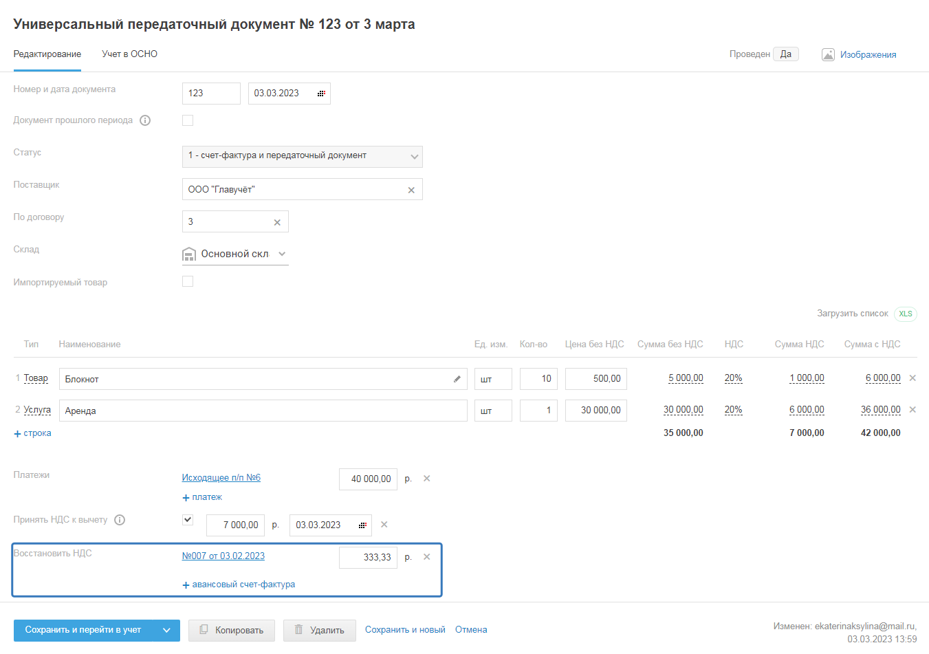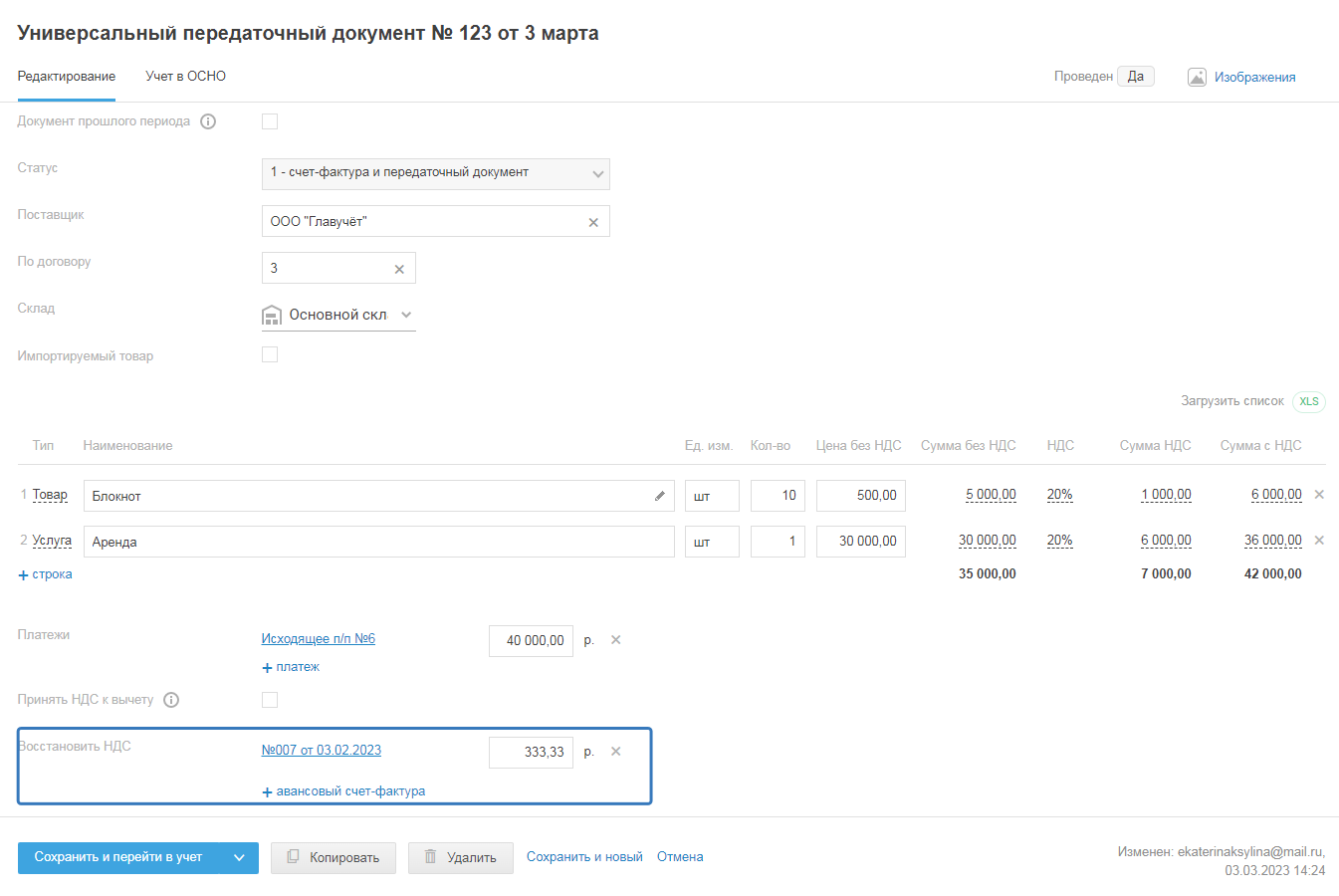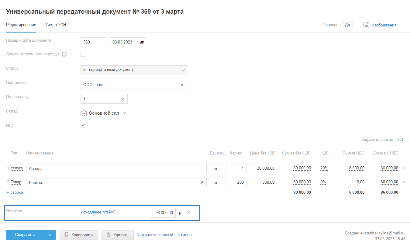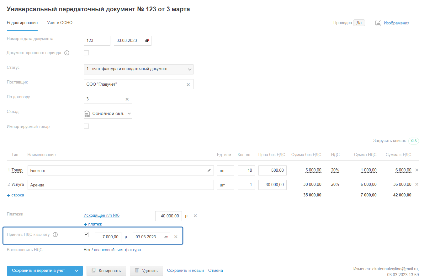 - Сохранить и перейти в учёт — чтобы перейти в режим учёта и посмотреть как УПД проведён в бухгалтерском и налоговом учётах.