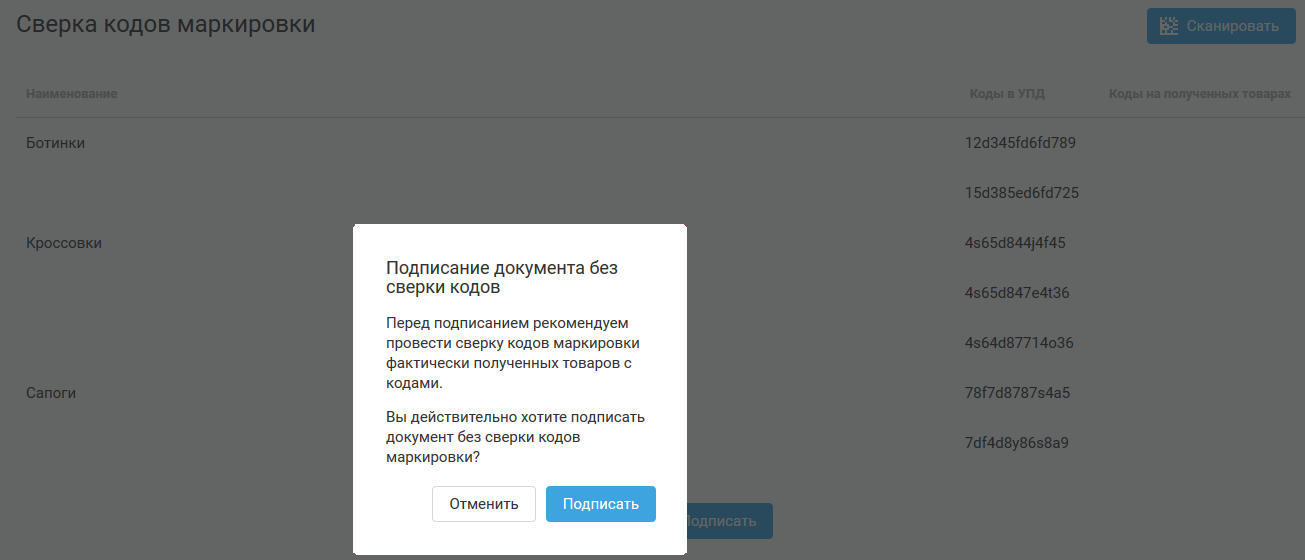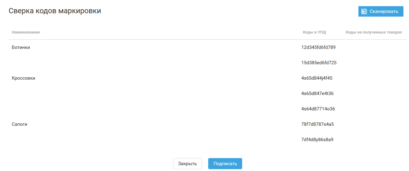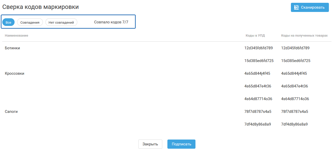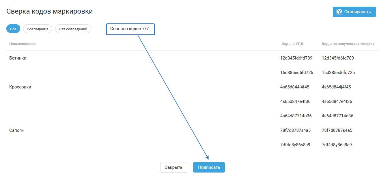 Если совпали все коды маркировки из документа с отсканированными, то каждому коду в УПД будет сопоставлен код на полученных товарах: