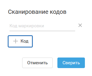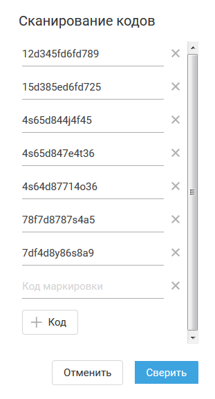 Отсканируйте коды маркировки с товара с помощью 2d-сканера или внесите их вручную: