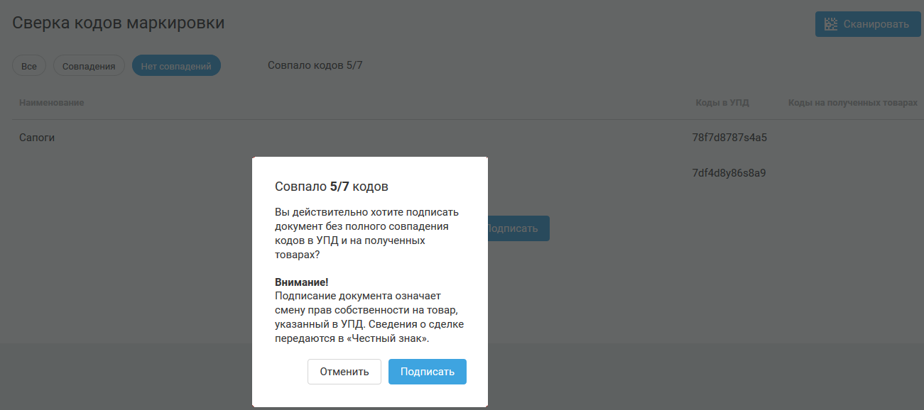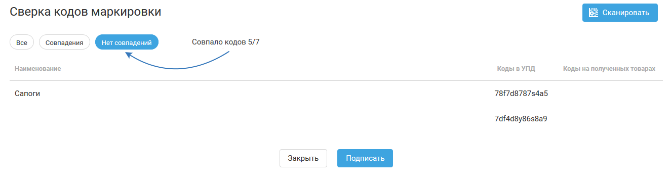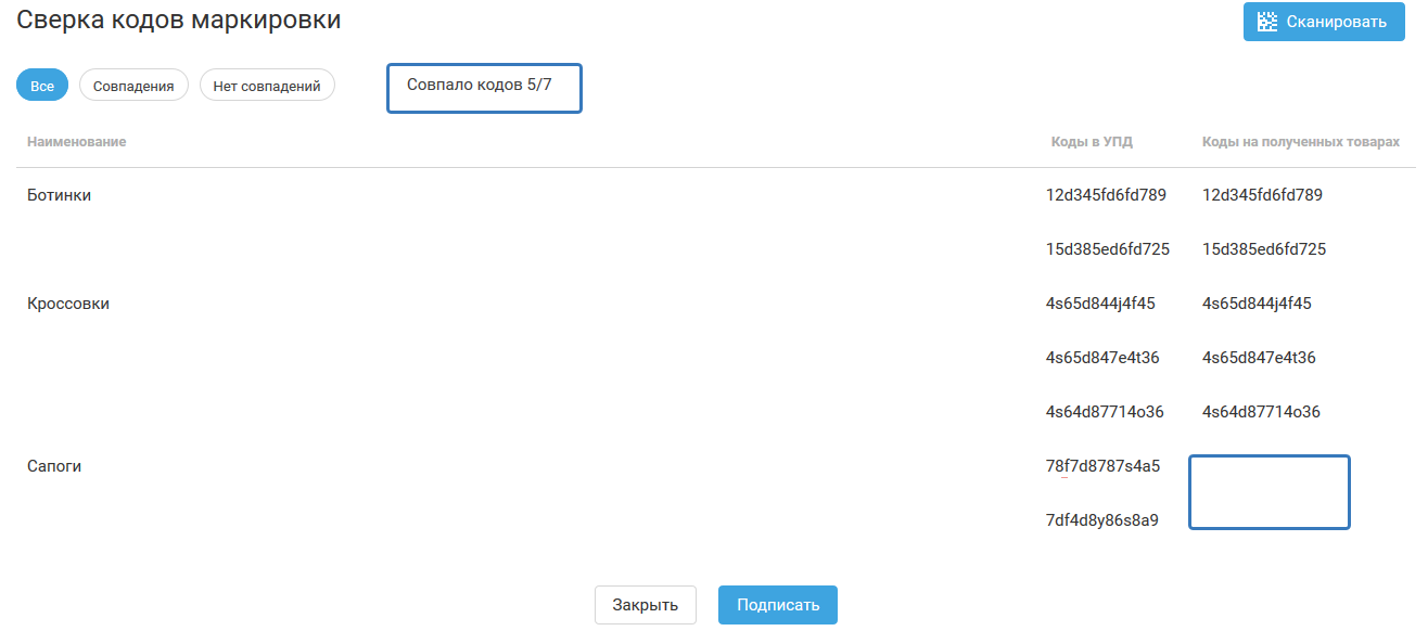 Если совпали не все коды маркировки, то напротив кода в УПД, по которому нет совпадений, будет пустое поле кода в полученных товарах, а в поле «Совпало» будет отображено количество совпавших кодов: