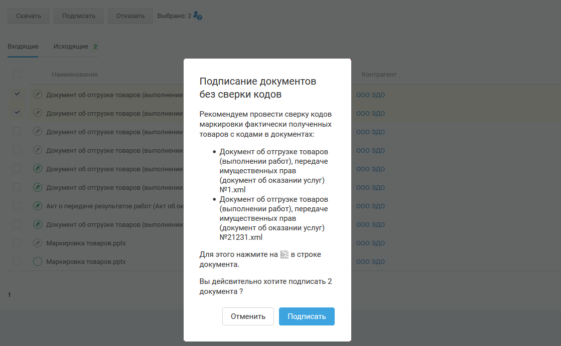 Если не совпал ни один код маркировки, то при подписании данного документа будет выведено сообщение: