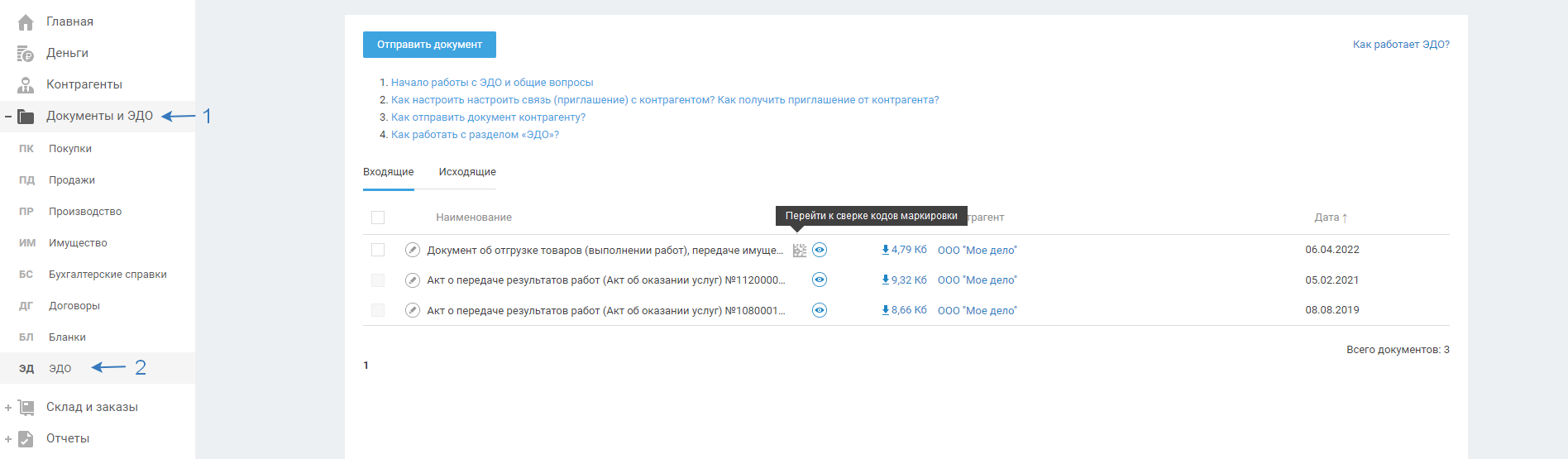 При получении по ЭДО УПД с маркированными позициями внутри вы увидите иконку DATA MATRIX кода: