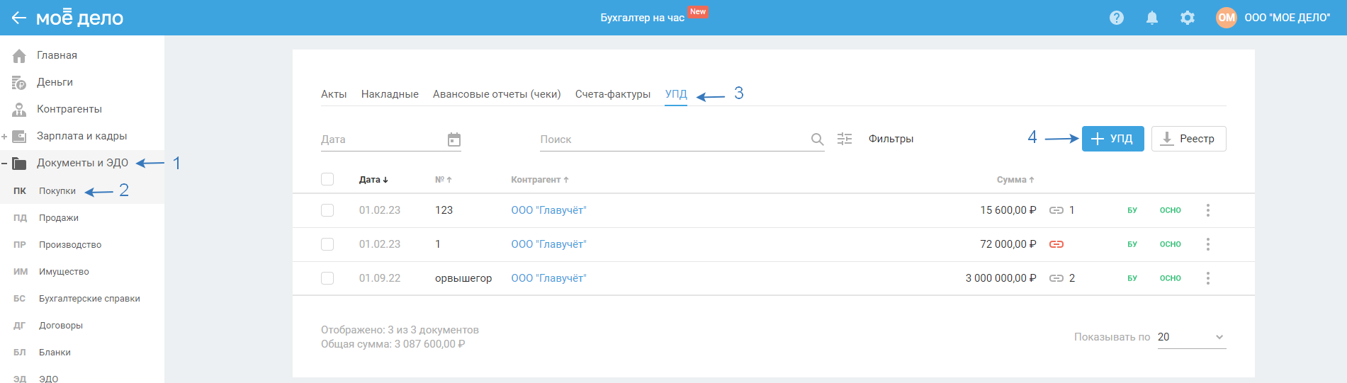 Для создания УПД перейдите в раздел «Документы и ЭДО — Покупки» и нажмите на кнопку «+ УПД»: