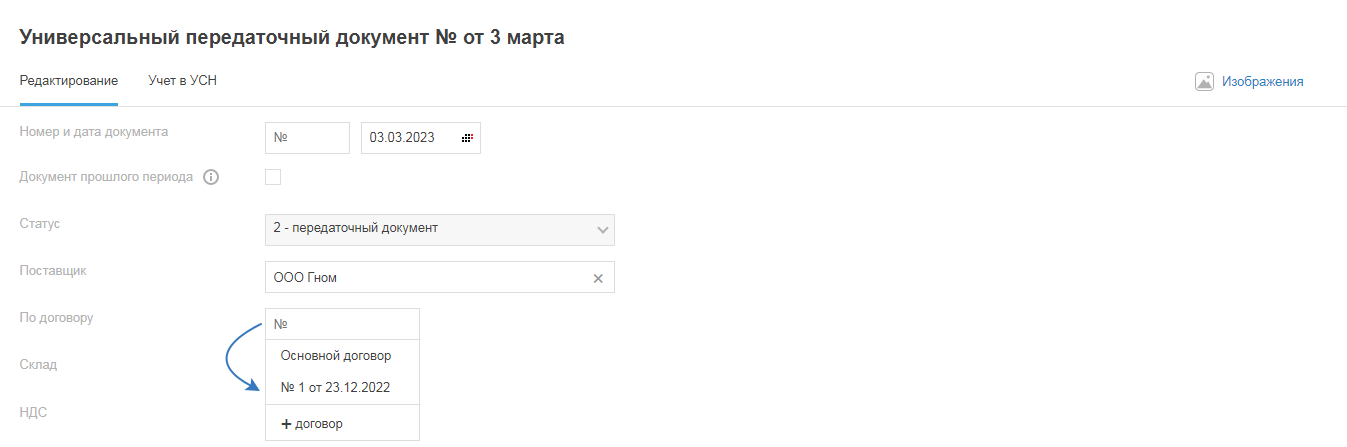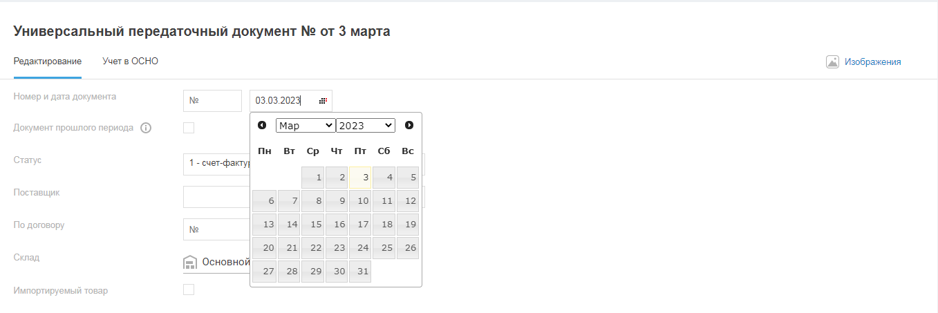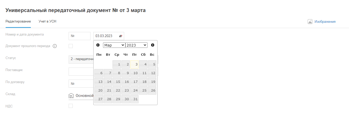 Номер и дата документа — по умолчанию номер не заполнен, дата — указывается текущее число. Номер и дату документа заполните также как в УПД полученном от поставщика. Дату можно выбирать из прошлого и будущего периодов:
