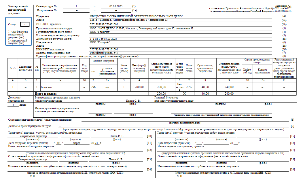 - 20%, то в документе устанавливается статус 1 — счёт-фактура + передаточный документ.