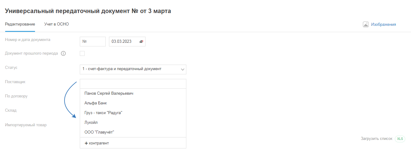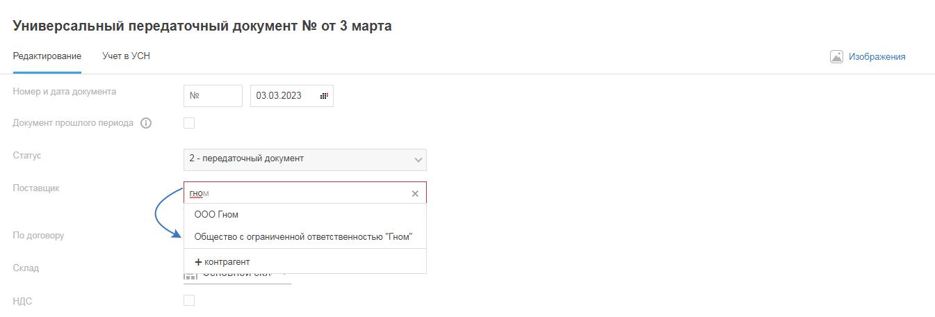 Поставщик. Выберите клиента из выпадающего списка. По умолчанию в списке до 5 контрагентов расположенных в алфавитном порядке, укажите одного из них, либо начните печать наименования контрагента, после чего выберите его из списка. Если в сервисе контрагент не заведён, выберите опцию «+ контрагент» создайте нового контрагента.