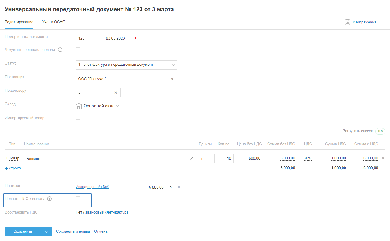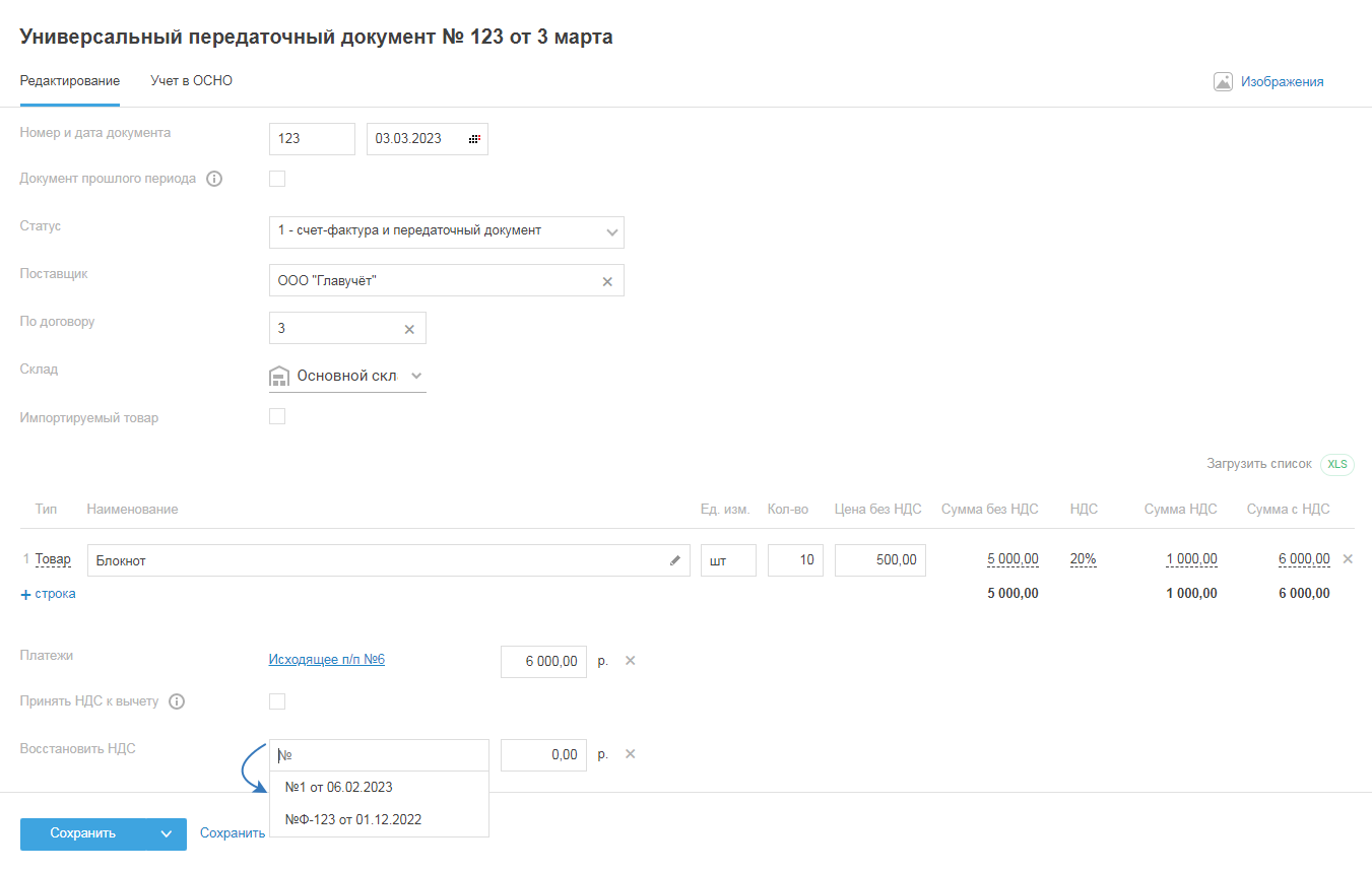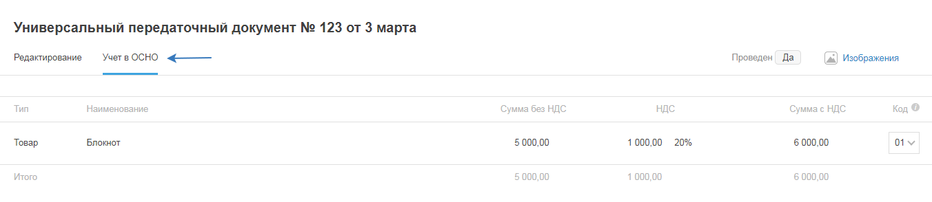 Если УПД ранее был создан, то откройте его и перейдите во вкладку «Учёт в ОСНО»: