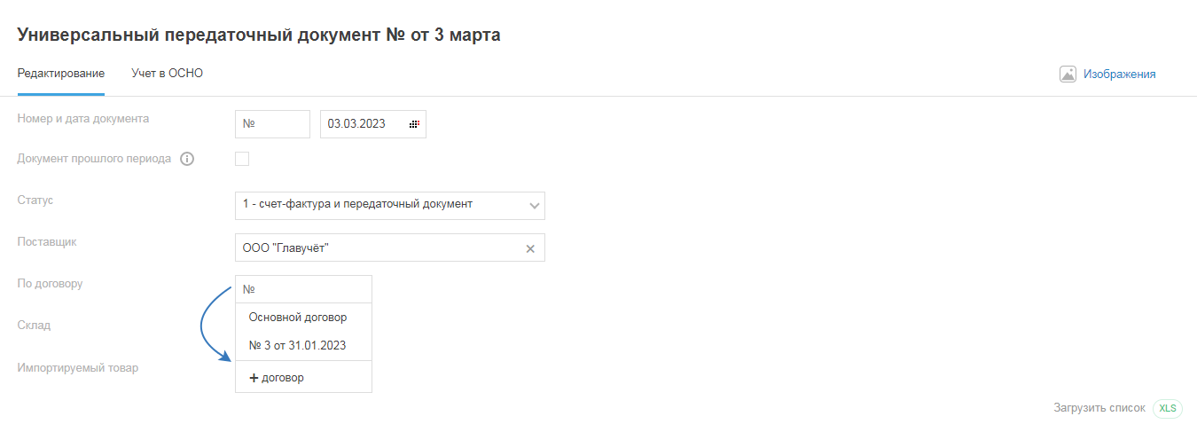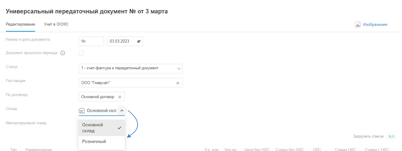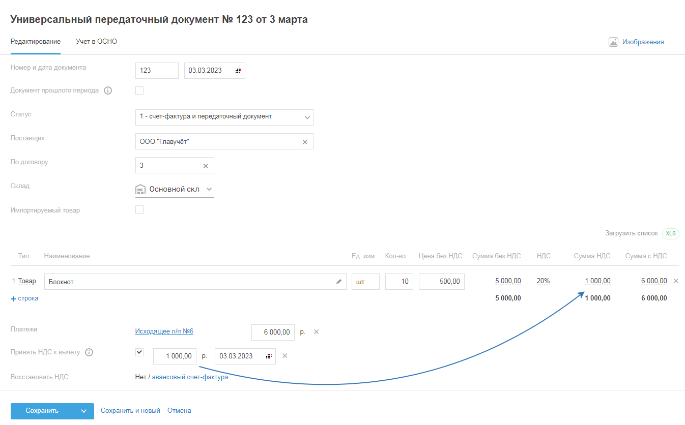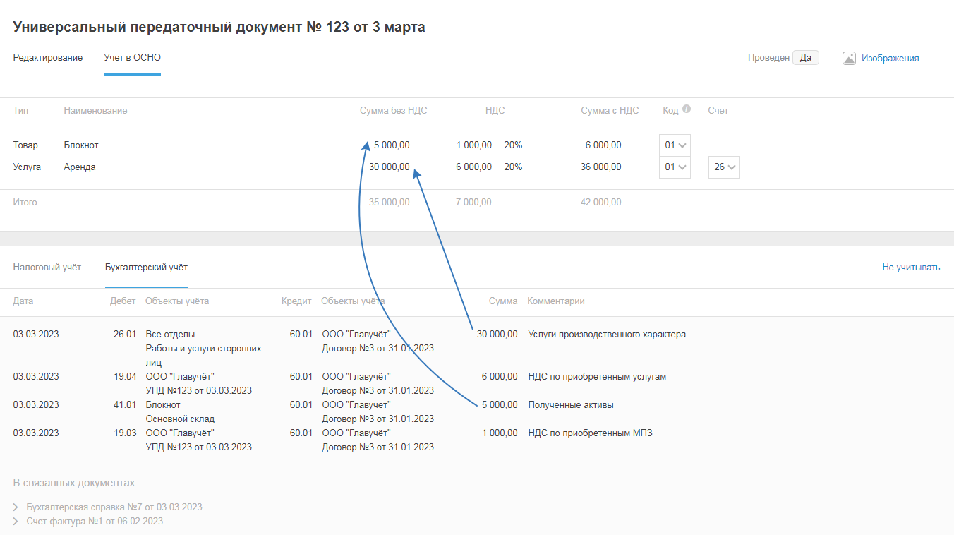 Если УПД ранее был создан, то откройте его и перейдите во вкладку «Учёт в ОСНО»: