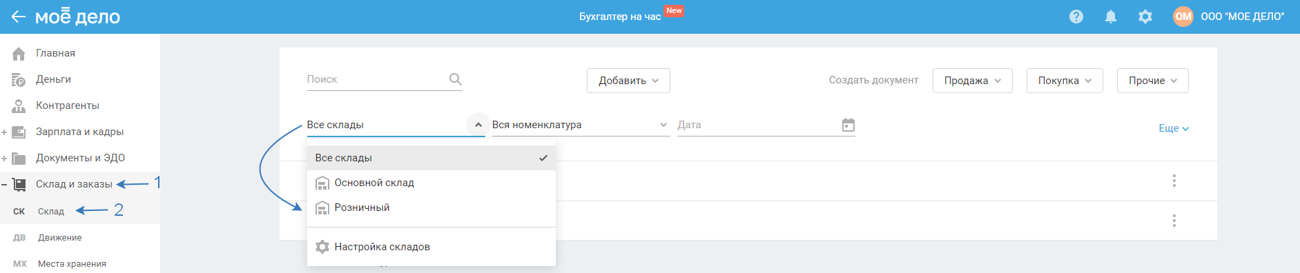 Склад — по умолчанию используется основной склад, для выбора из выпадающего списка, склад предварительно нужно создать в разделе «Склад и заказы — Склад».