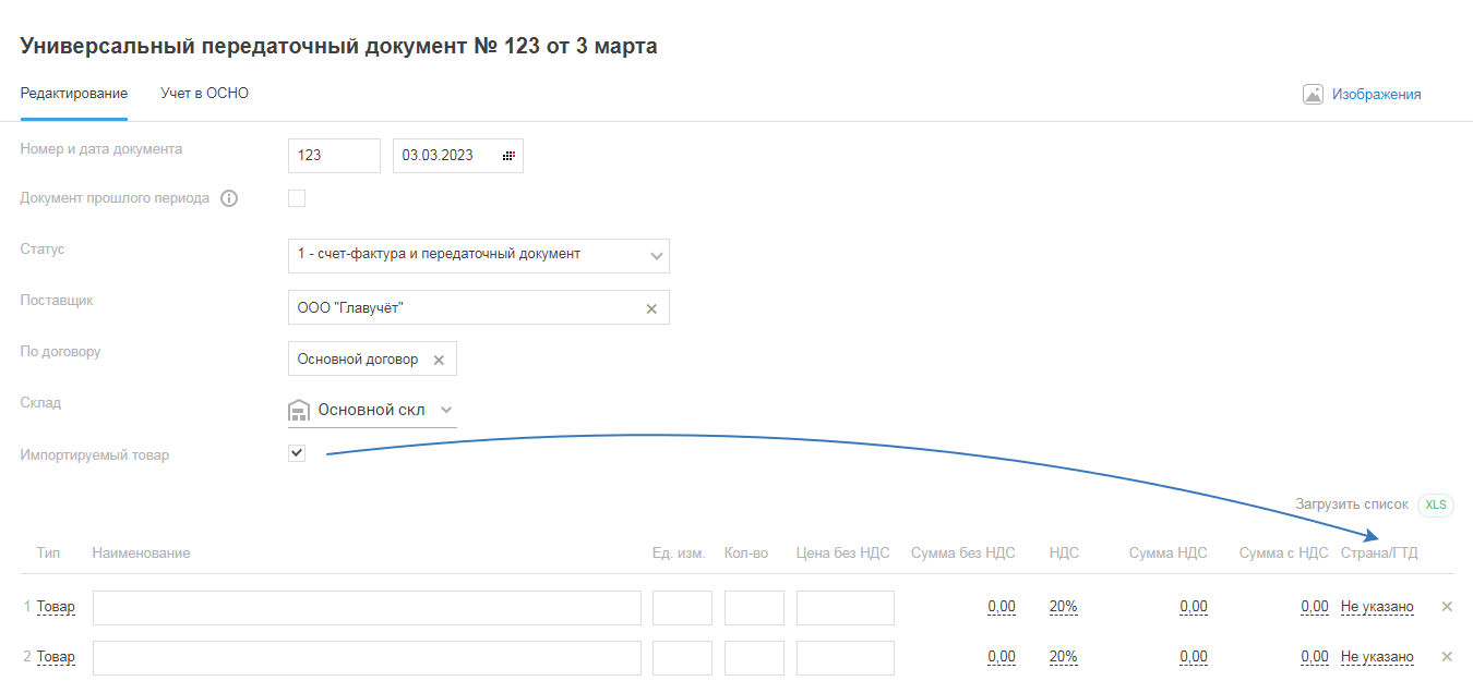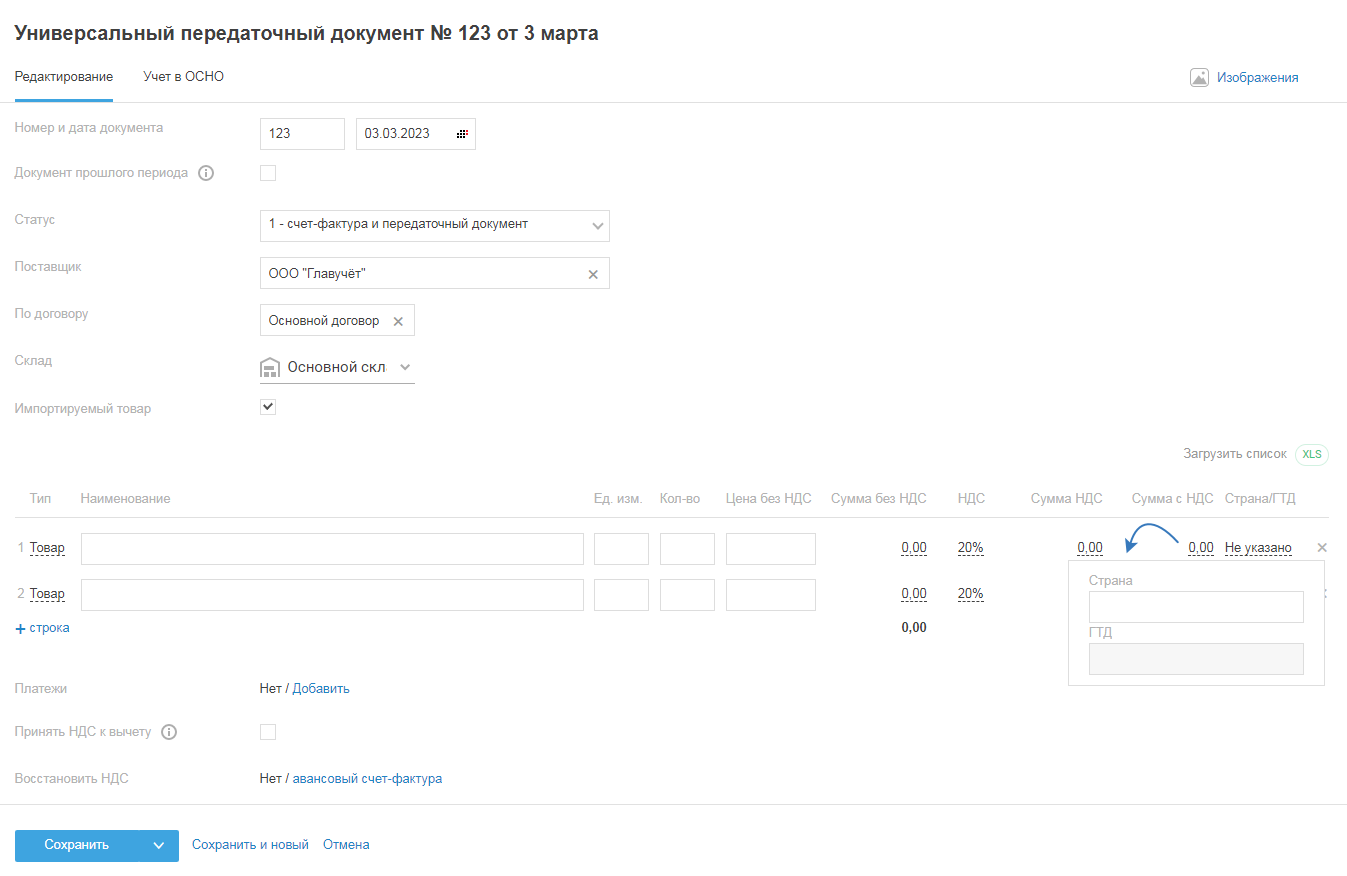 Импортируемый товар — если по документам у вас импортируемый товар от поставщика, выберите настройку (поставьте галку), при этом появится графа Страна/ГТД, в которой для услуг будет стоять прочерк, а для товаров/материалов можно будет выбрать страну происхождения товара и указать номер грузовой таможенной декларации (ГТД).