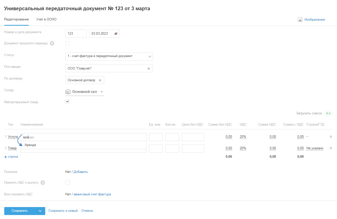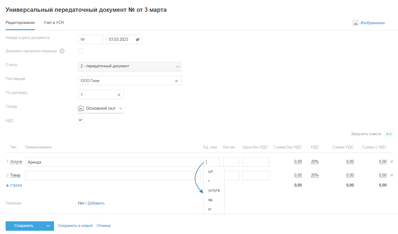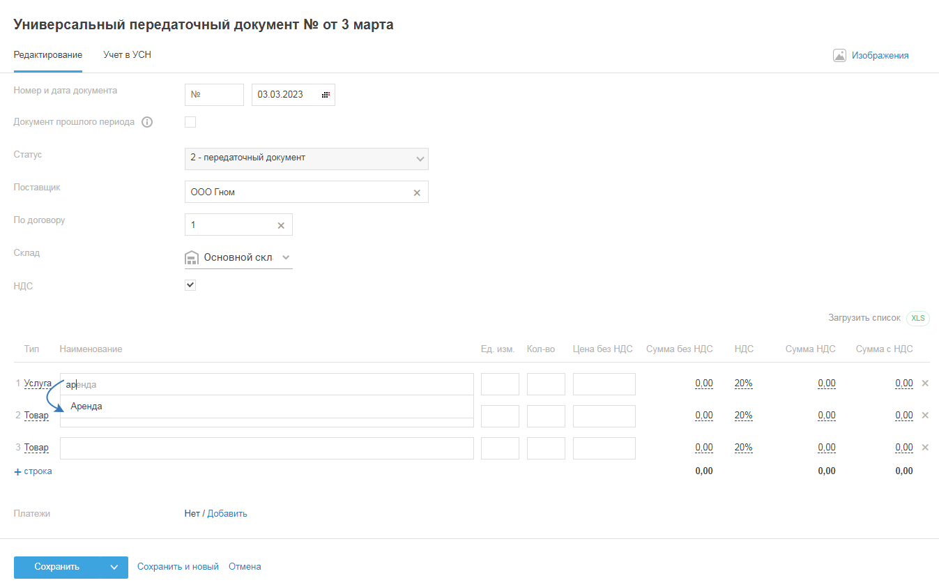 Либо введите новое наименование услуги. После сохранения УПД, при создании следующих документов наименование услуги будет доступно из выпадающего списка, т.е. будет работать автозаполнение. Наименование услуги необязательно вводить точно такое же как в УПД поставщика, введите любое удобное название. Например, наименование «Аренда коммерческой недвижимости» можете заменить на «Аренда».