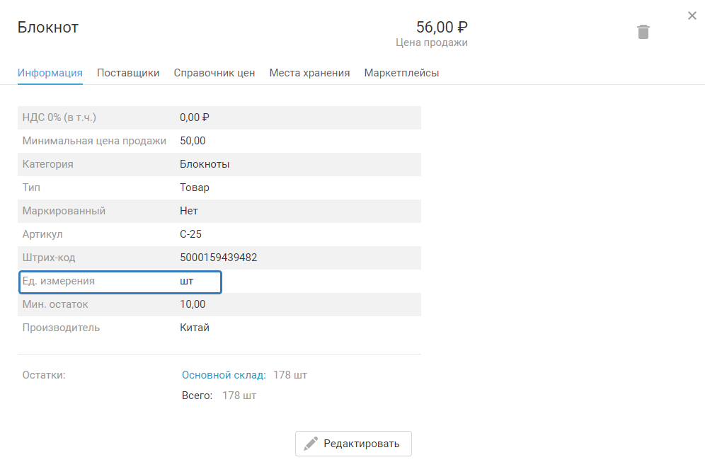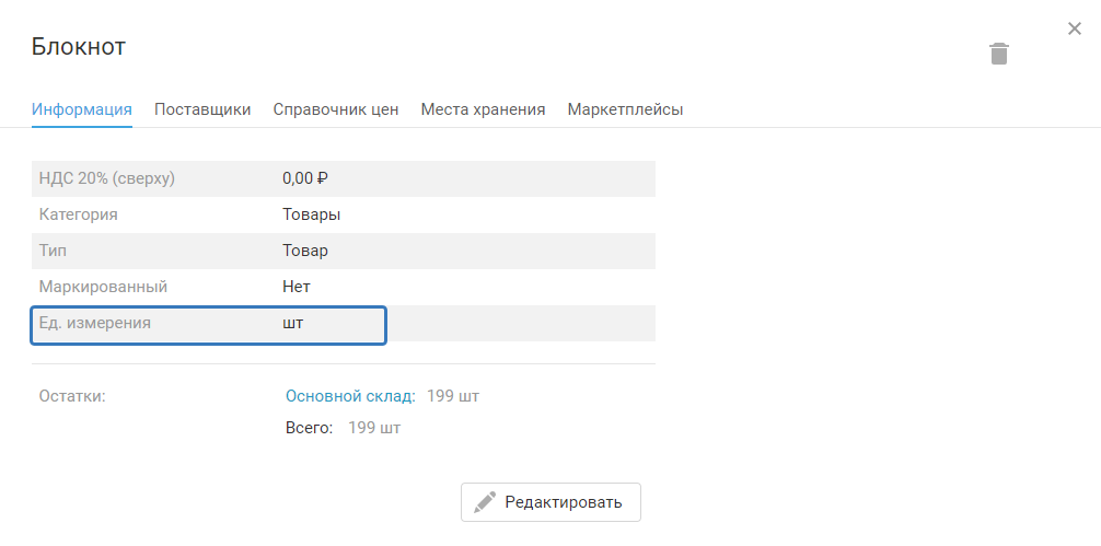 - Единица измерения для товаров/материалов заполнится автоматически из карточки товара: