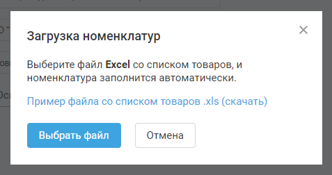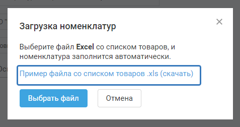 Выберите файл Excel со списком товаров, и номенклатура заполнится автоматически: