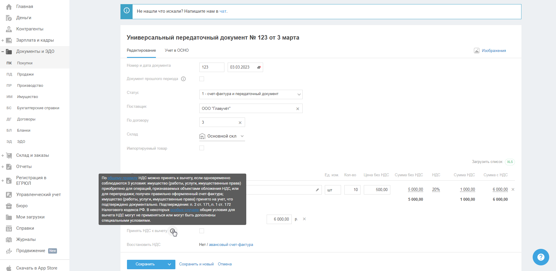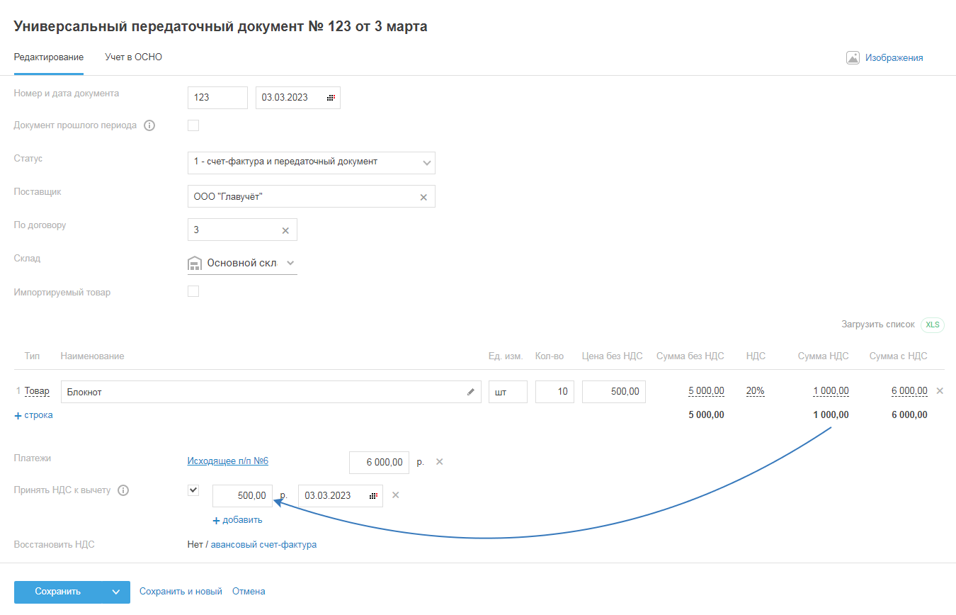 По умолчанию сервис принимает к вычету всю сумму НДС по документу: