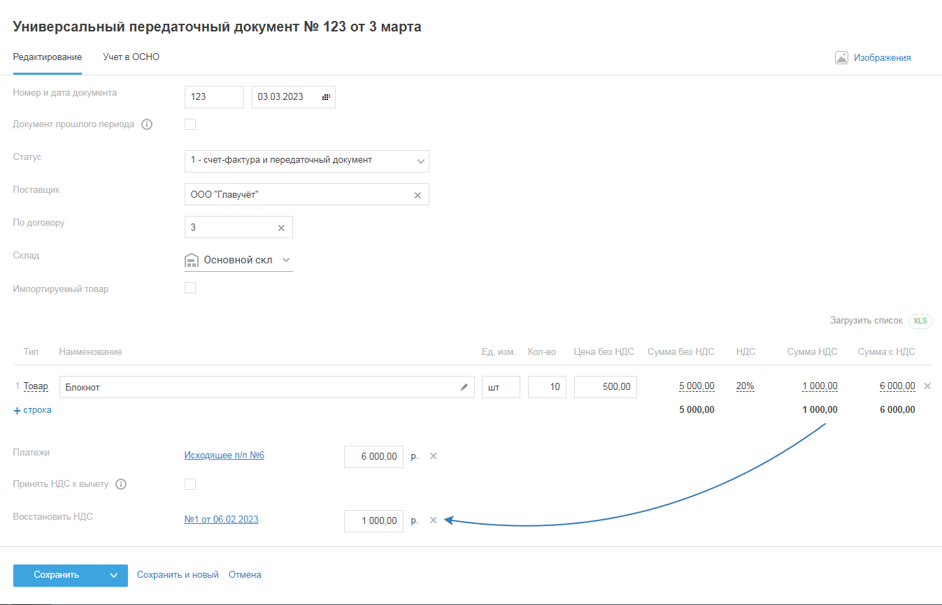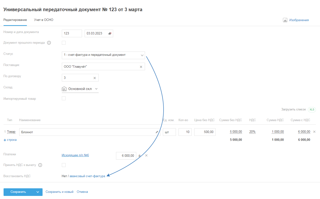 Ссылка «восстановить НДС» доступна при любом статусе УПД (1 — счёт-фактура и передаточный документ; 2 — передаточный документ), только при статусе 1 данная опция появляется по умолчанию,