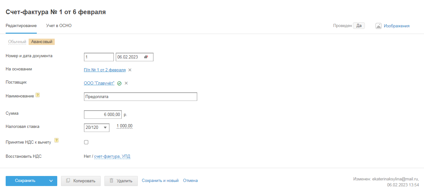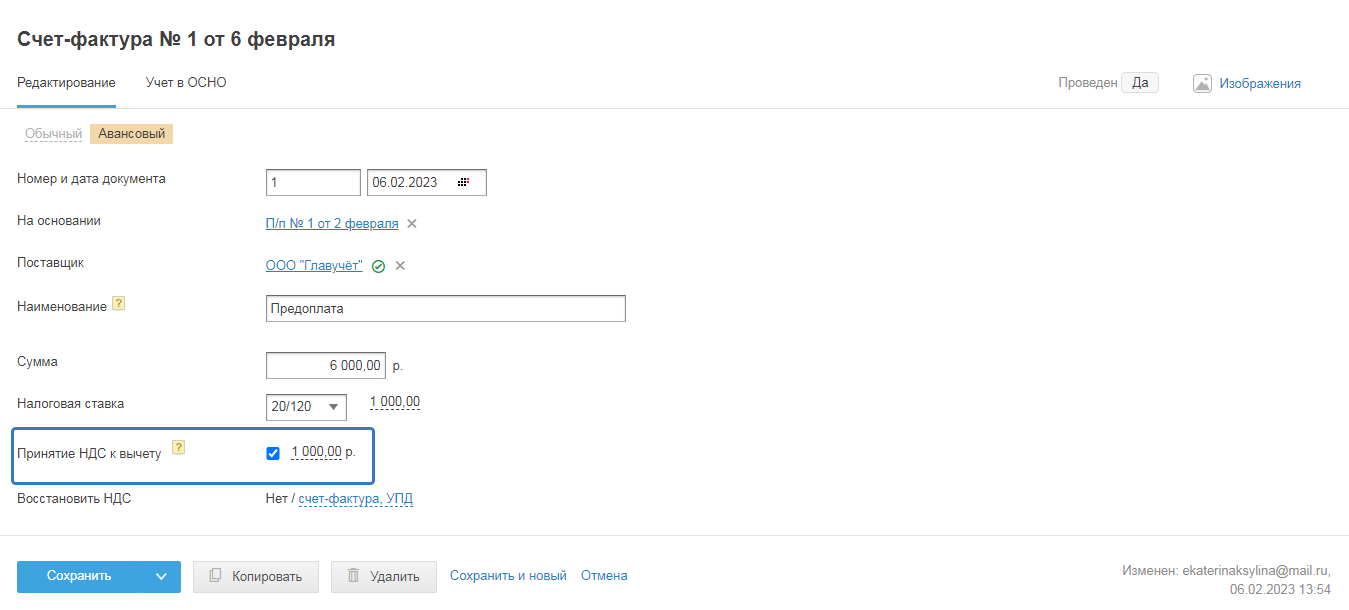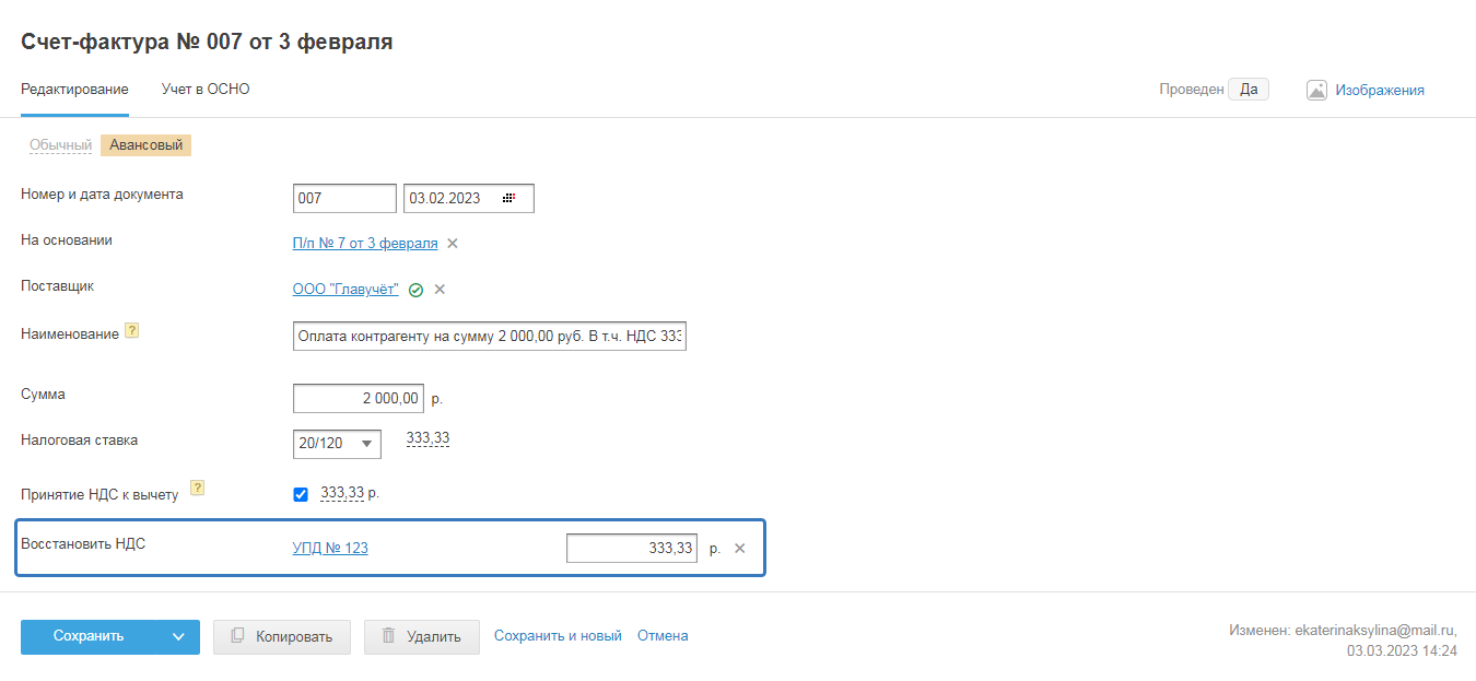 Проводка по восстановлению НДС формируется, если в УПД во вкладке «Редактирование» в строке «Восстановить НДС» указаны авансовые счета-фактуры.