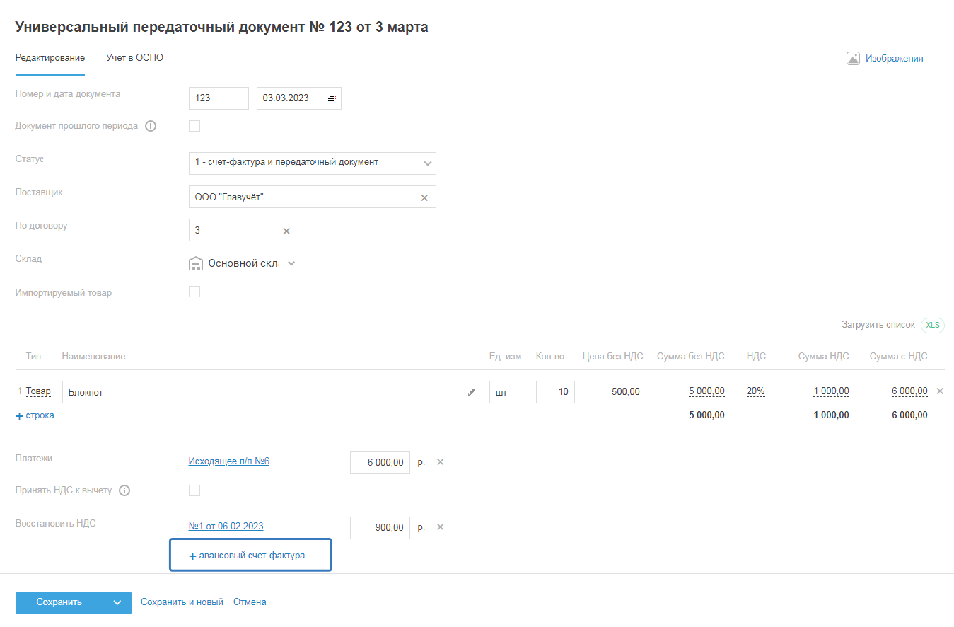 Сумма значений, указанных в строке «Восстановить НДС», не может превышать значение из графы «сумма НДС» документа и если это значение меньше, тогда появляется ссылка «+ авансовый счёт-фактура», с помощью которой вы можете добавлять авансовые счета-фактуры, пока их сумма не станет равной значению из графы «сумма НДС» УПД.