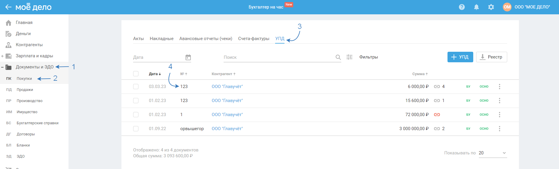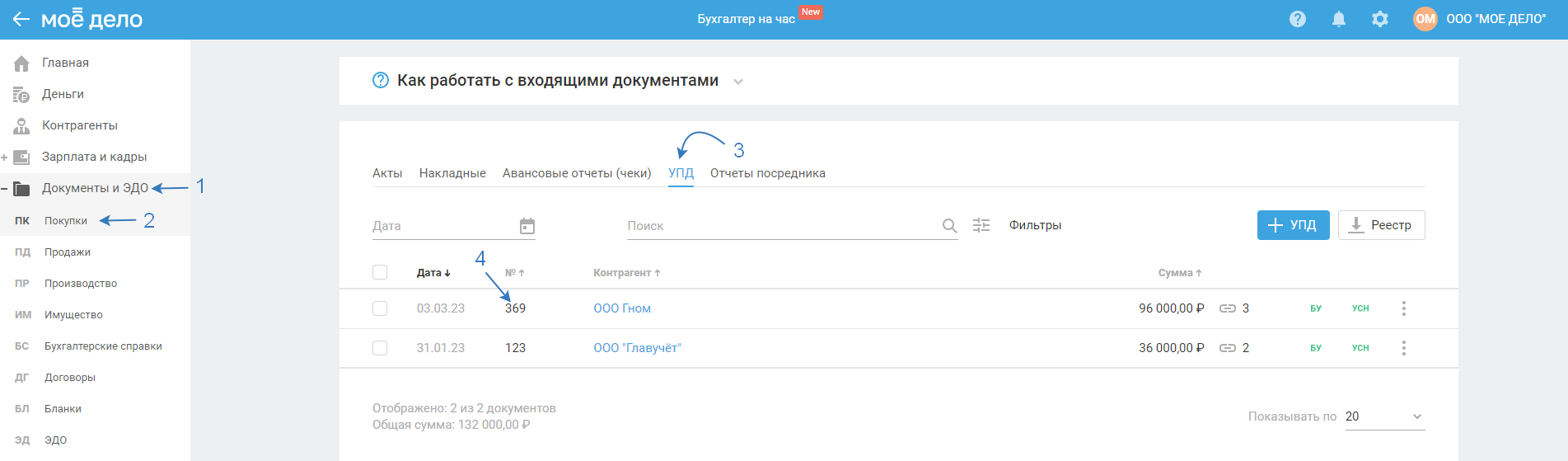 - Сохранить документ — после чего откроется раздел Документы и ЭДО — Покупки — УПД.