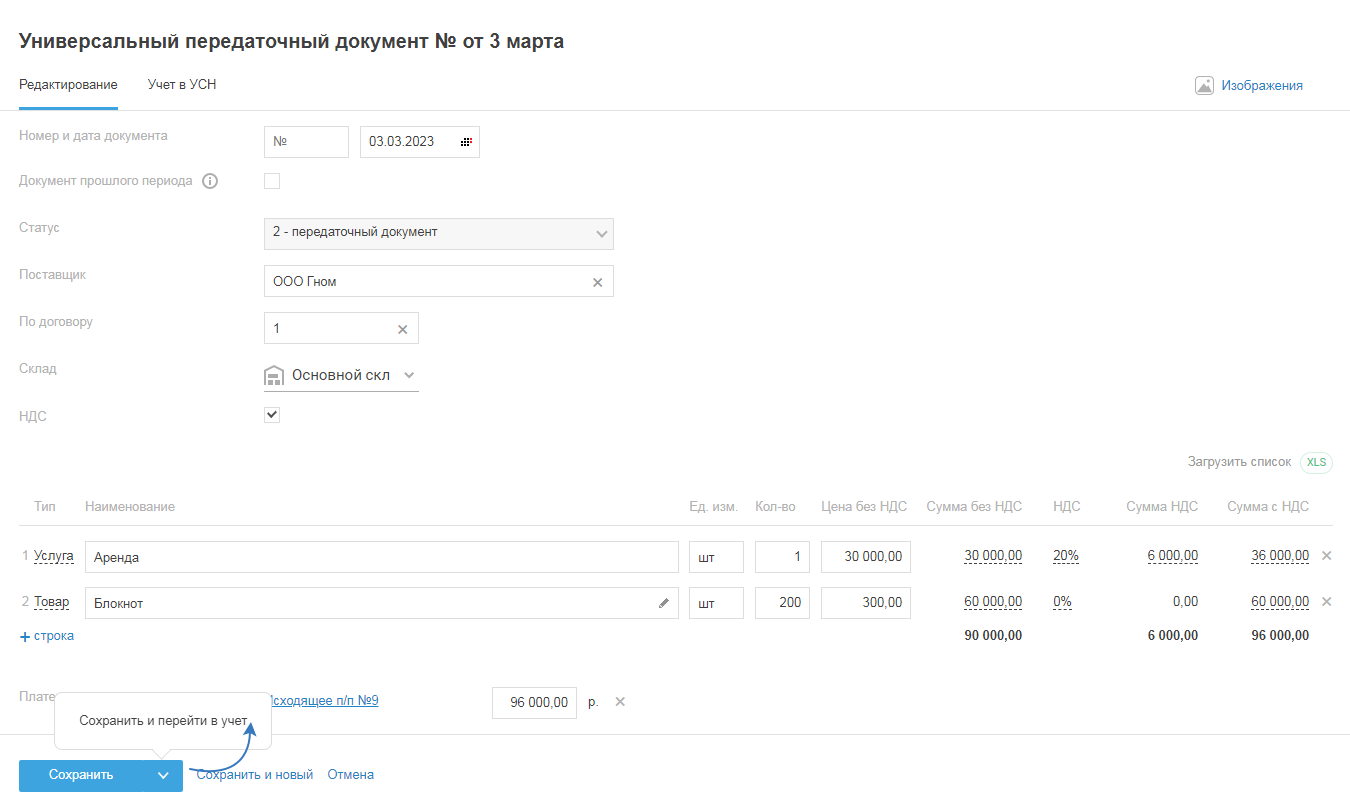 Перейти во вкладку «Учёт» можно при создании УПД, после заполнения всех необходимых полей, для этого нажмите на кнопку «Сохранить и перейти в учёт»: