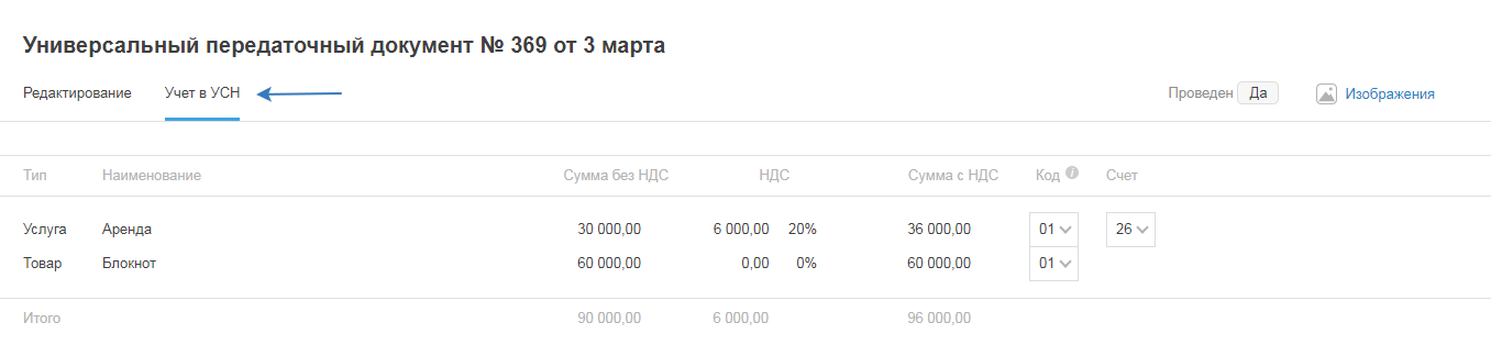Если УПД ранее был создан, то откройте его и перейдите во вкладку «Учёт в УСН»:
