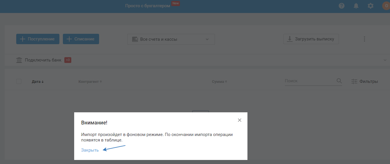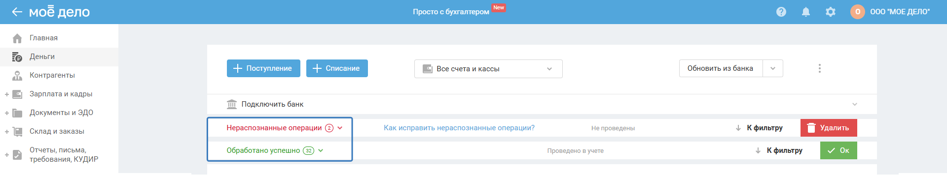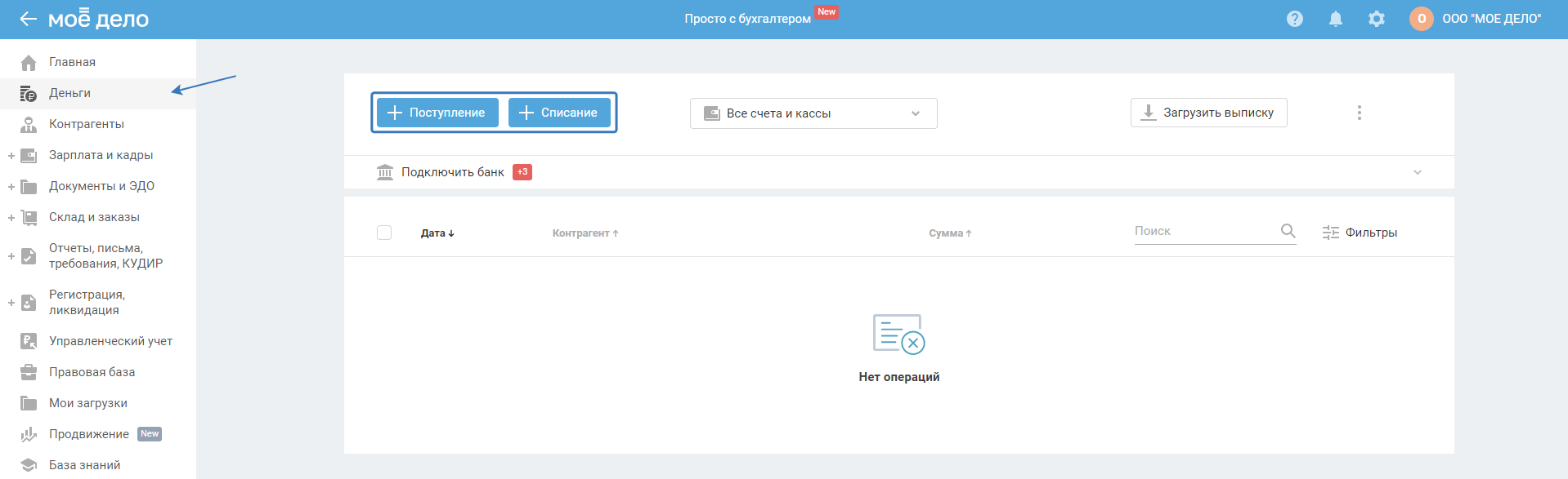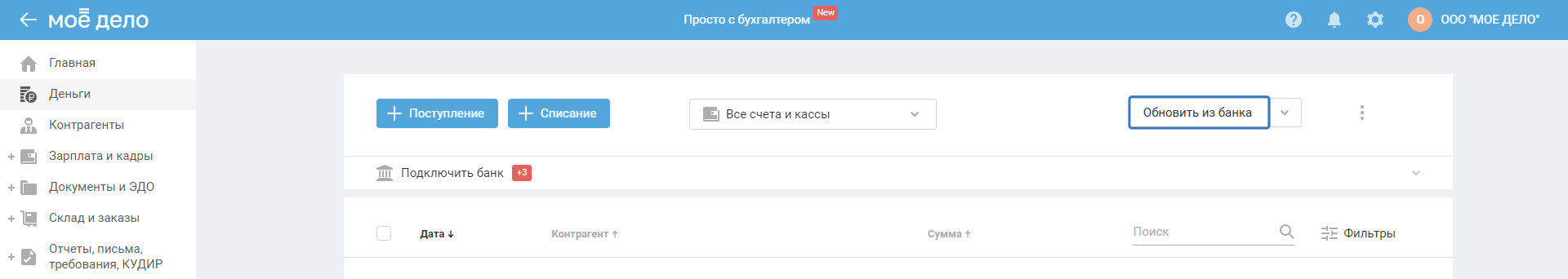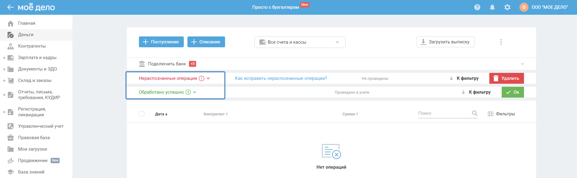 Безналичные банковские операции в раздел «Деньги» загружаются и разбираются автоматически раз в сутки при наличии подключенной интеграции с банком-партнёром по выбранному расчётному счёту.