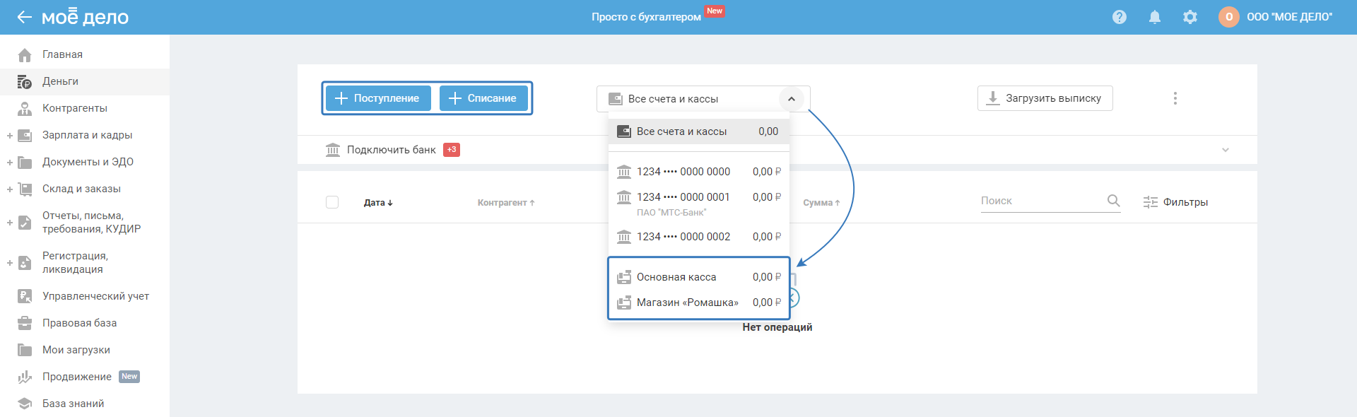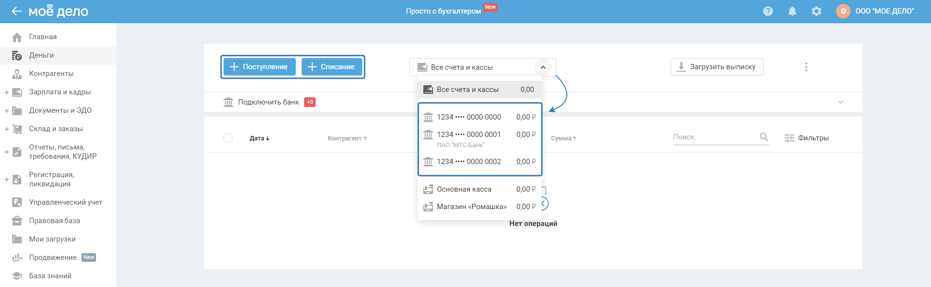 Для создания операций, прошедших по расчётному счёту, в поле «Все счета и кассы» выберите из списка расчётный счёт (счёт предварительно должен быть создан либо в реквизитах либо в разделе «Деньги»), после чего нажмите на кнопку «+ Поступление» или «+ Списание»: