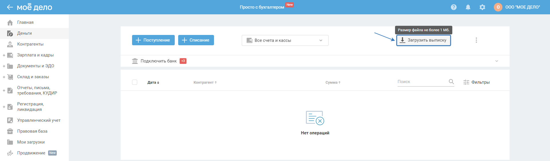 Если с банком, в котором у вас открыт расчётный счёт, сервис не поддерживает обмен данными, вы можете загрузить операции в ручном режиме с помощью банковской выписки, для этого в разделе «Деньги» нажмите на кнопку «Загрузить файл». Для загрузки используйте стандартный файл формата 1c.txt (для этого пройдите в интернет-банк, укажите счёт, с которого вы хотите получить выписку, период, выберите формат для экспорта файла 1С, скачайте данный файл):