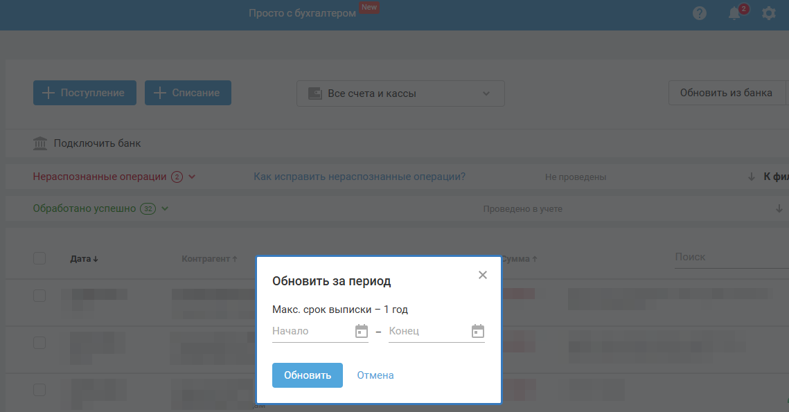 При необходимости загрузите недостающие операции по расчётному счёту, нажав на кнопку «Обновить из банка»: