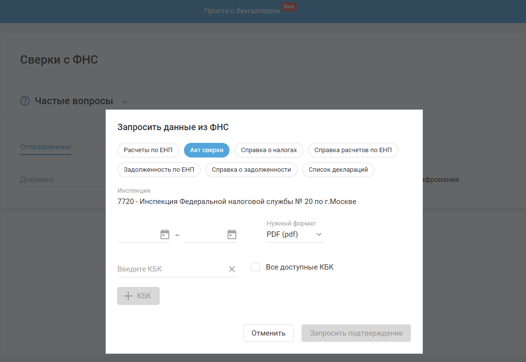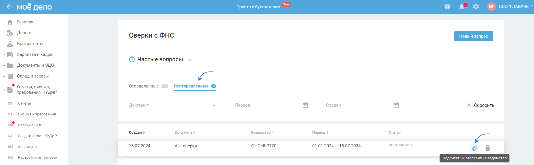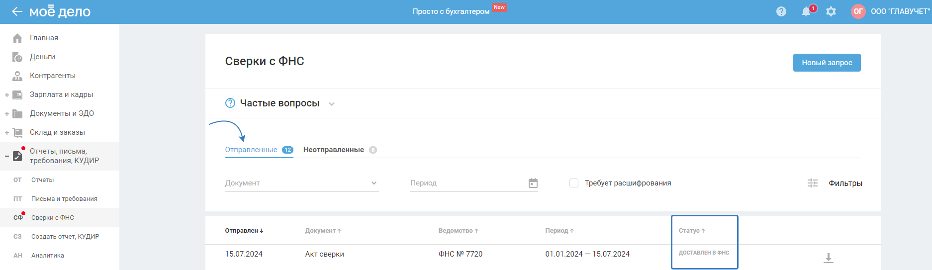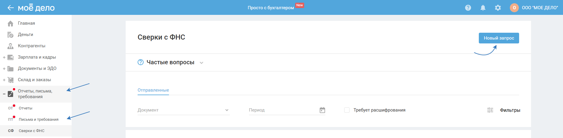 Например, вы отправляете запрос в ФНС на получение сверки. Для этого перейдите в раздел «Отчёты, письма, требования — Сверки с ФНС» и нажмите «Новый запрос»: