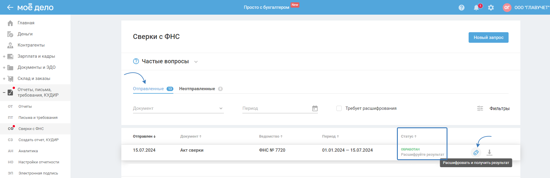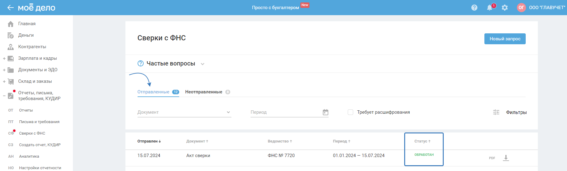 После подписания и отправки отчёт будет передан в обработку и будет находиться во вкладке «Отправленные», статус отправки поменяется на «Отправлен».