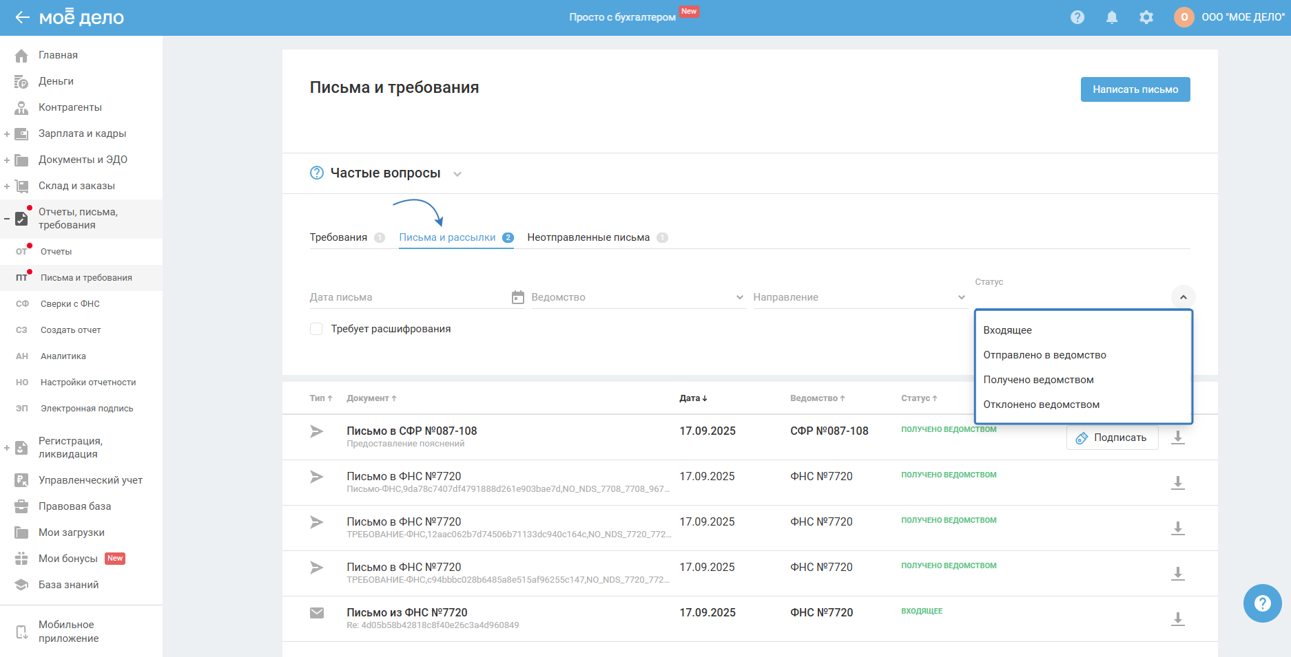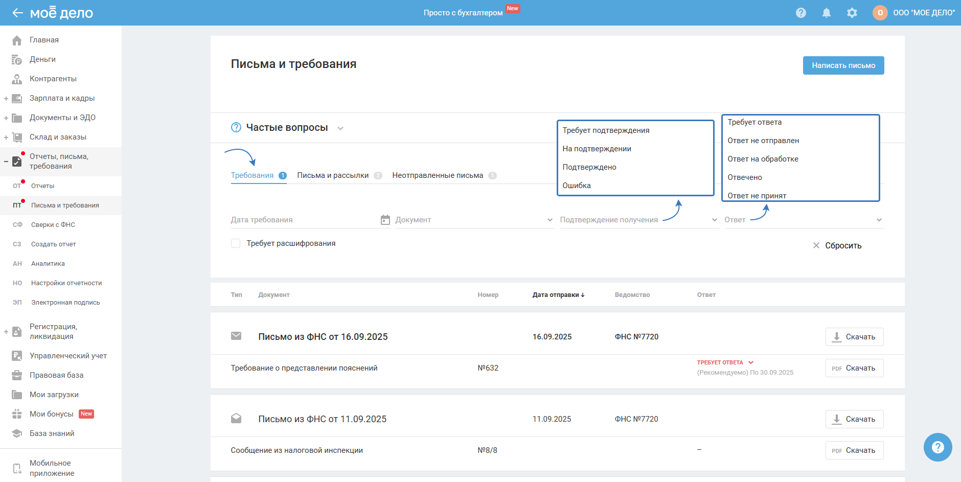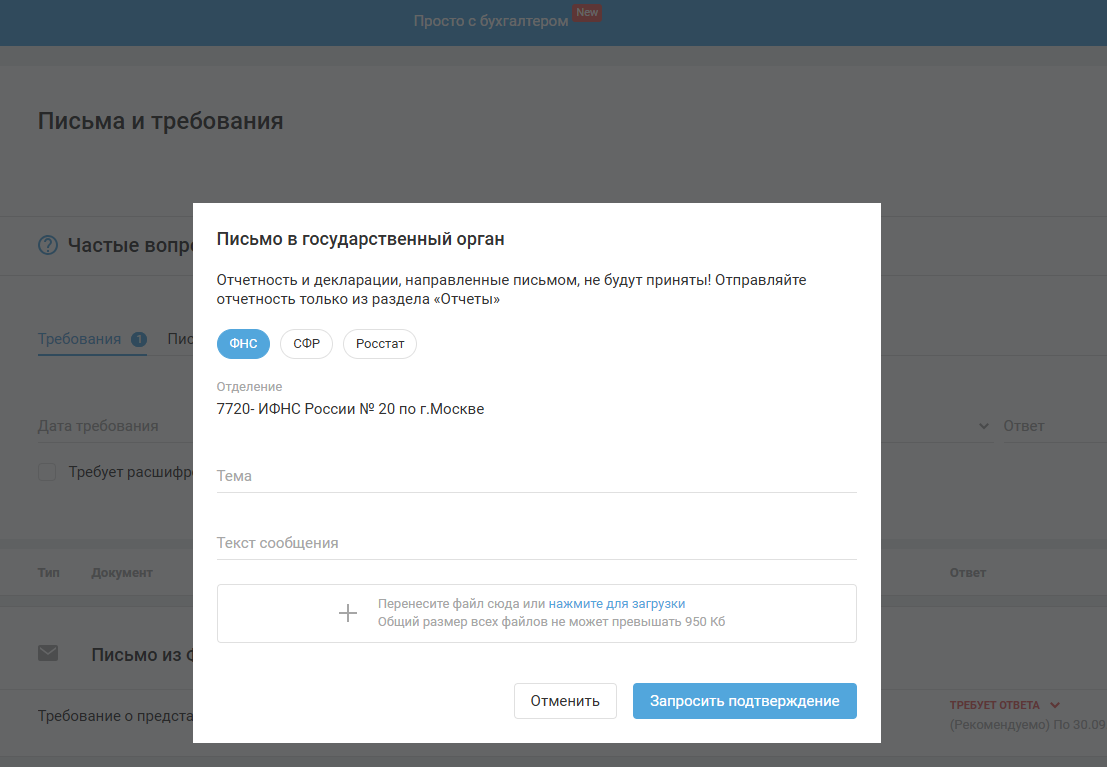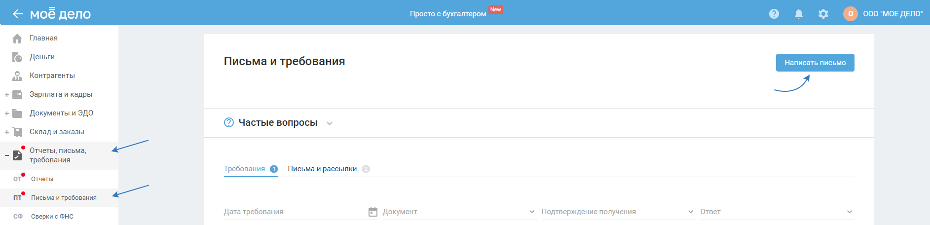 Например, вы отправляете письмо в ФНС. Для этого перейдите в раздел «Отчёты, письма, требования — Письма и требования» и нажмите на кнопку «Написать письмо»: