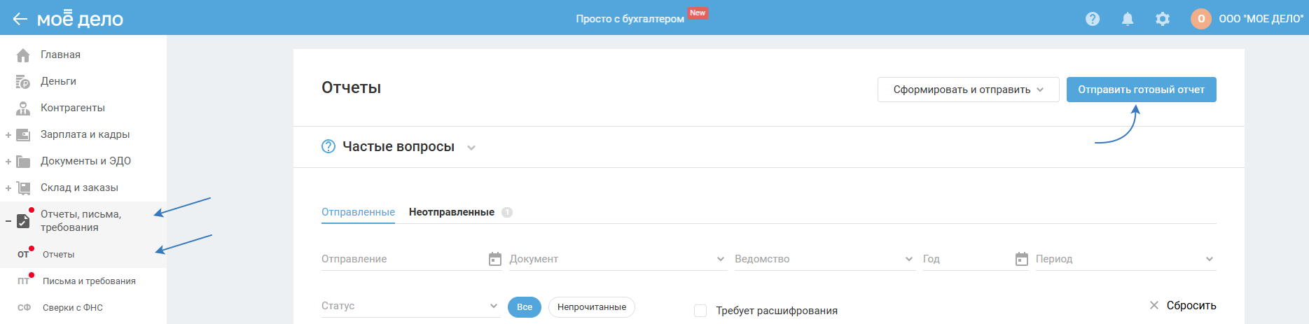 Например, вы отправляете отчёт в ФНС. Для этого перейдите в раздел «Отчёты, письма, требования — Отчёты» и нажмите «Отправить готовый отчёт»: