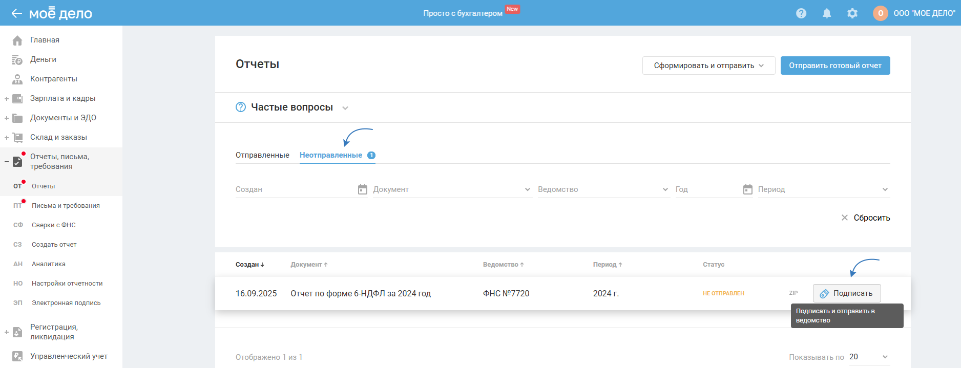 Пока вы не подпишите отправку, отчёт не будет отправлен в фонд (статус «Не отправлен»).