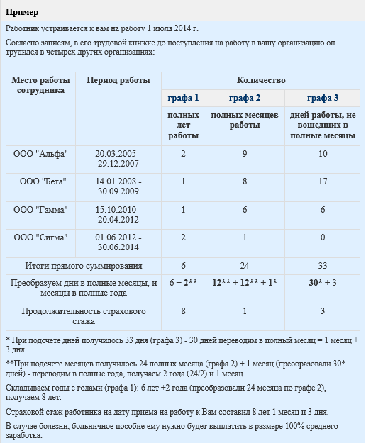 Трудовой стаж складывается из периодов работы по трудовому договору (по трудовой книжке), гражданско-правовому договору (только если по нему уплачивались взносы в ФСС), государственной, военной и иной службы, периода деятельности ИП. Период работы сотрудника можно определить на основании записей в трудовой книжке либо иных документов (к примеру, военный билет – за время службы).