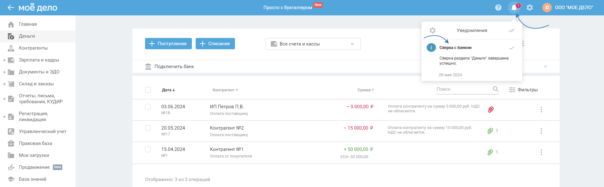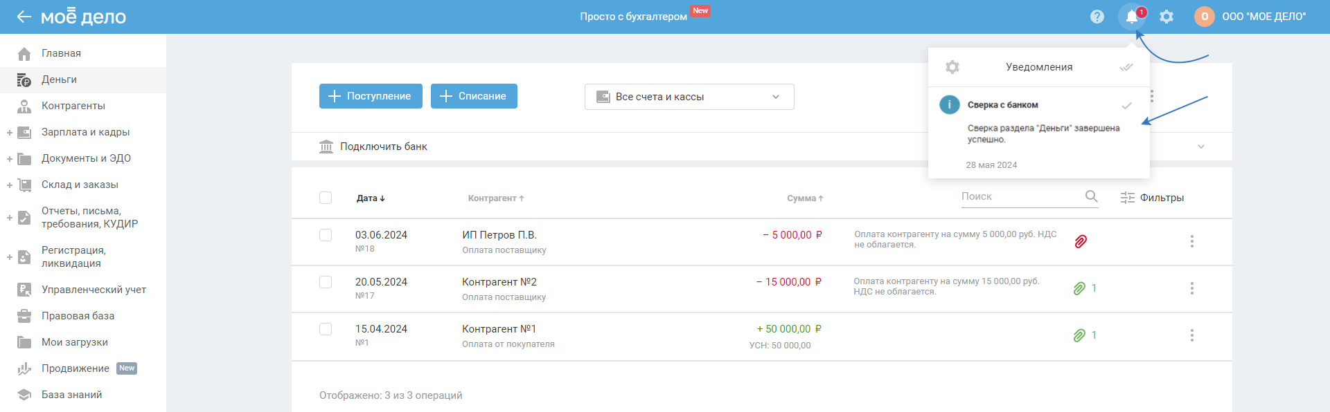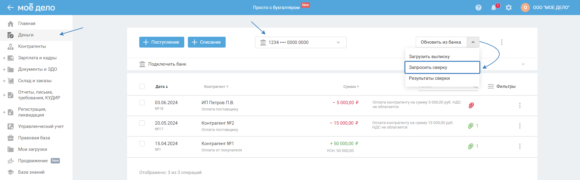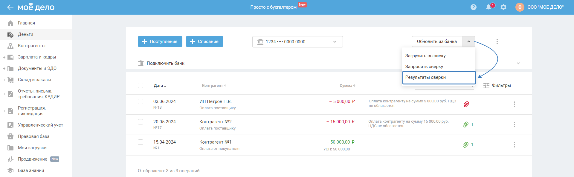 2. Полученные данные из выписки сверяются с операциями в сервисе по типу (поступление/списание), сумме и дате.