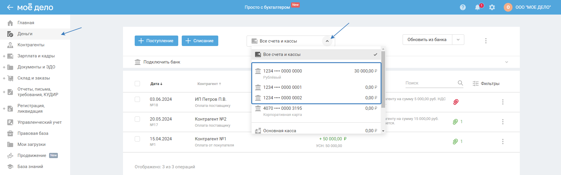 В разделе «Деньги» нажмите «Все счета и кассы» и выберите из списка расчётный счёт: