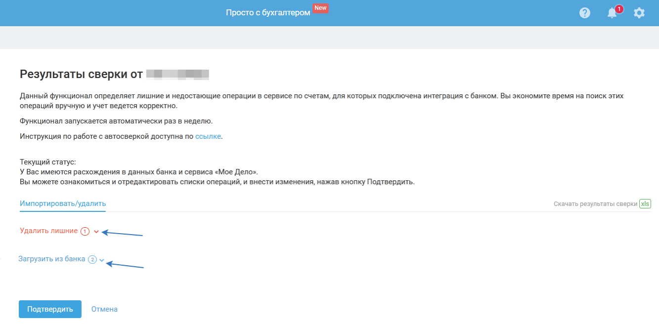 - Загрузить из банка. В результате сверки в банковской выписке обнаружены операции, отсутствующие в сервисе, в связи с этим рекомендация добавить такие операции в сервис.