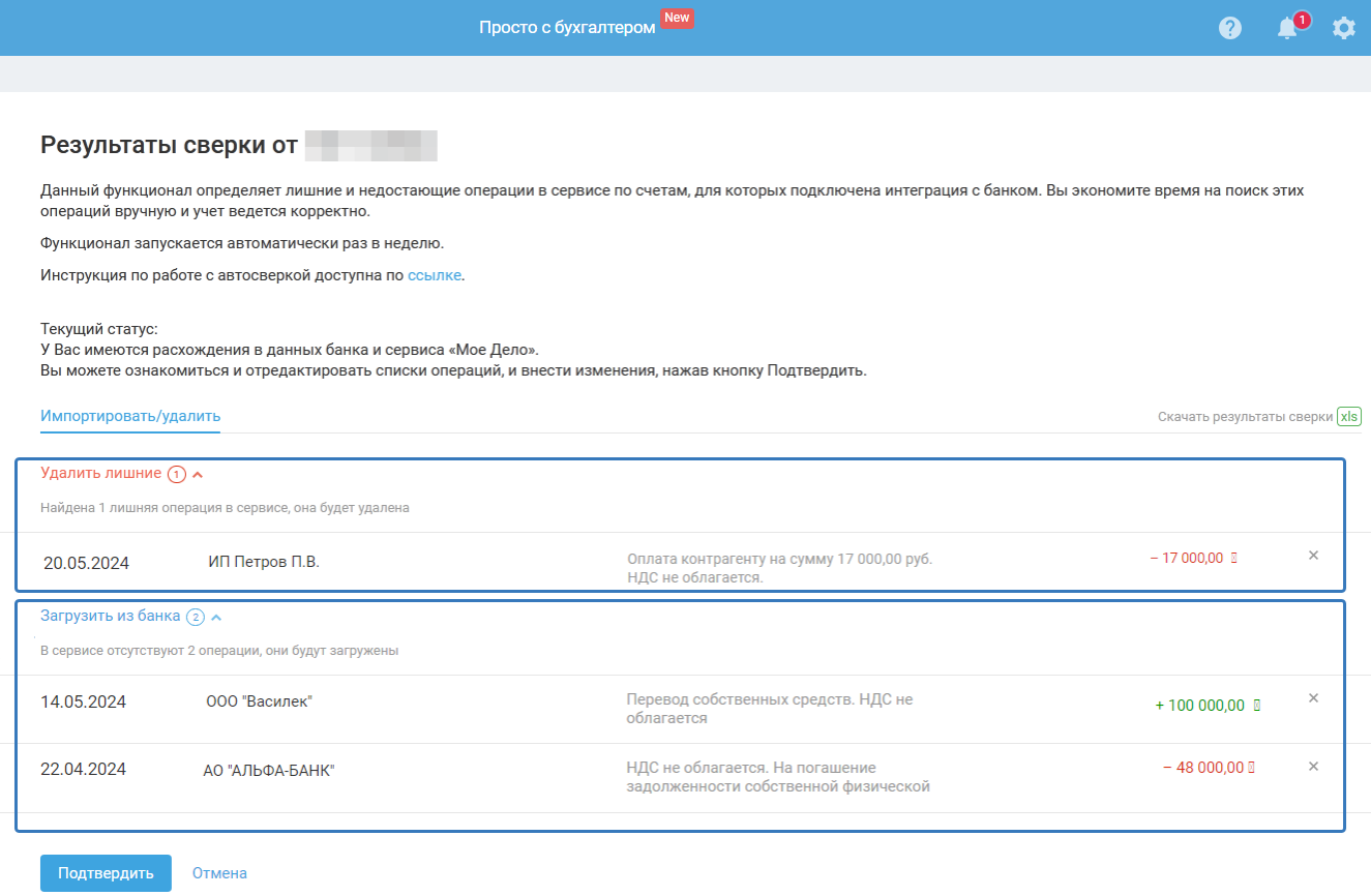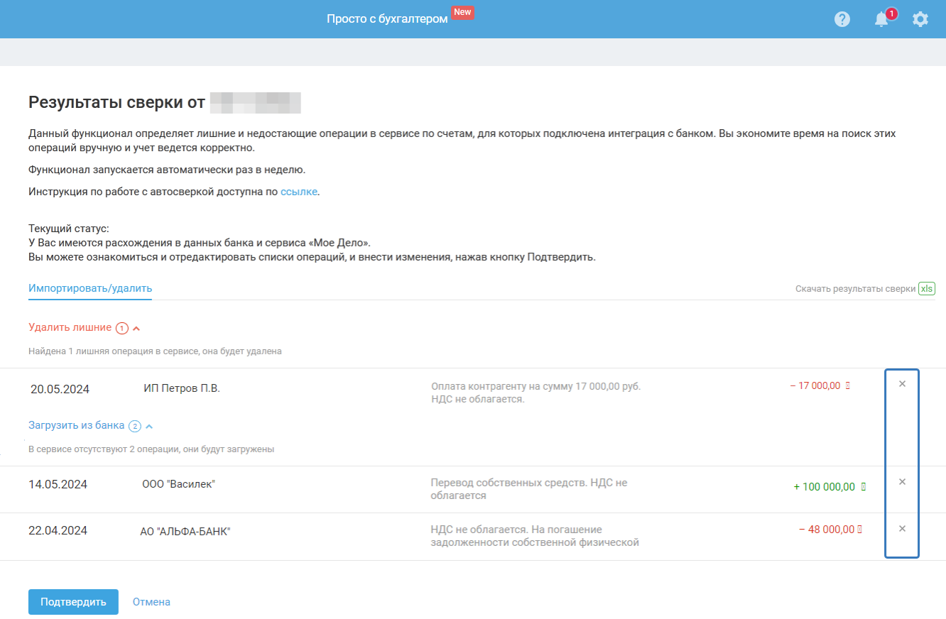 - Удалить лишние. В результате сверки в сервисе обнаружены операции, отсутствующие в банковской выписке, в связи с этим рекомендация удалить такие операции из сервиса.