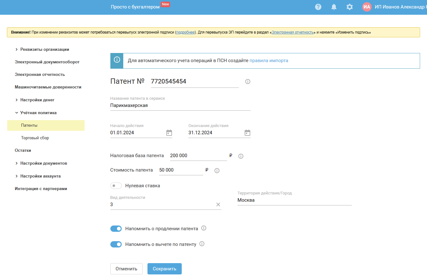 Включите настройку «Работодатель», если у вас есть сотрудники. При заполнении уведомления, утверждённого Приказом, ИП должен отразить признак налогоплательщика по каждому патенту, по которому он производит уменьшение суммы налога. При этом если ИП в календарном году получил несколько патентов и при осуществлении деятельности хотя бы по одному из них он использует труд наемных работников, то при подаче уведомления, утверждённого Приказом, в отношении всех патентов, у которых налоговый период (период действия патента) приходится на период, в котором использовался труд наемных работников, ИП должен указать признак налогоплательщика «1». Письмо ИФНС от 2 июня 2021 года N СД-4-3/7704@