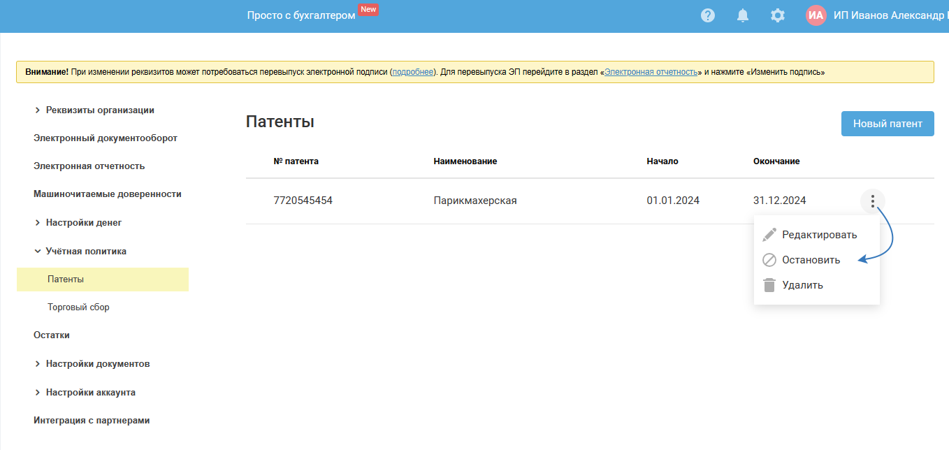 Отменить остановку патента, если, например, вы сделали это по неосторожности, в сервисе невозможно. Такой патент можно только удалить, если с ним не связана ни одна операция. Поэтому для редактирования патента в этом случае его нужно создать заново (старый удалите).