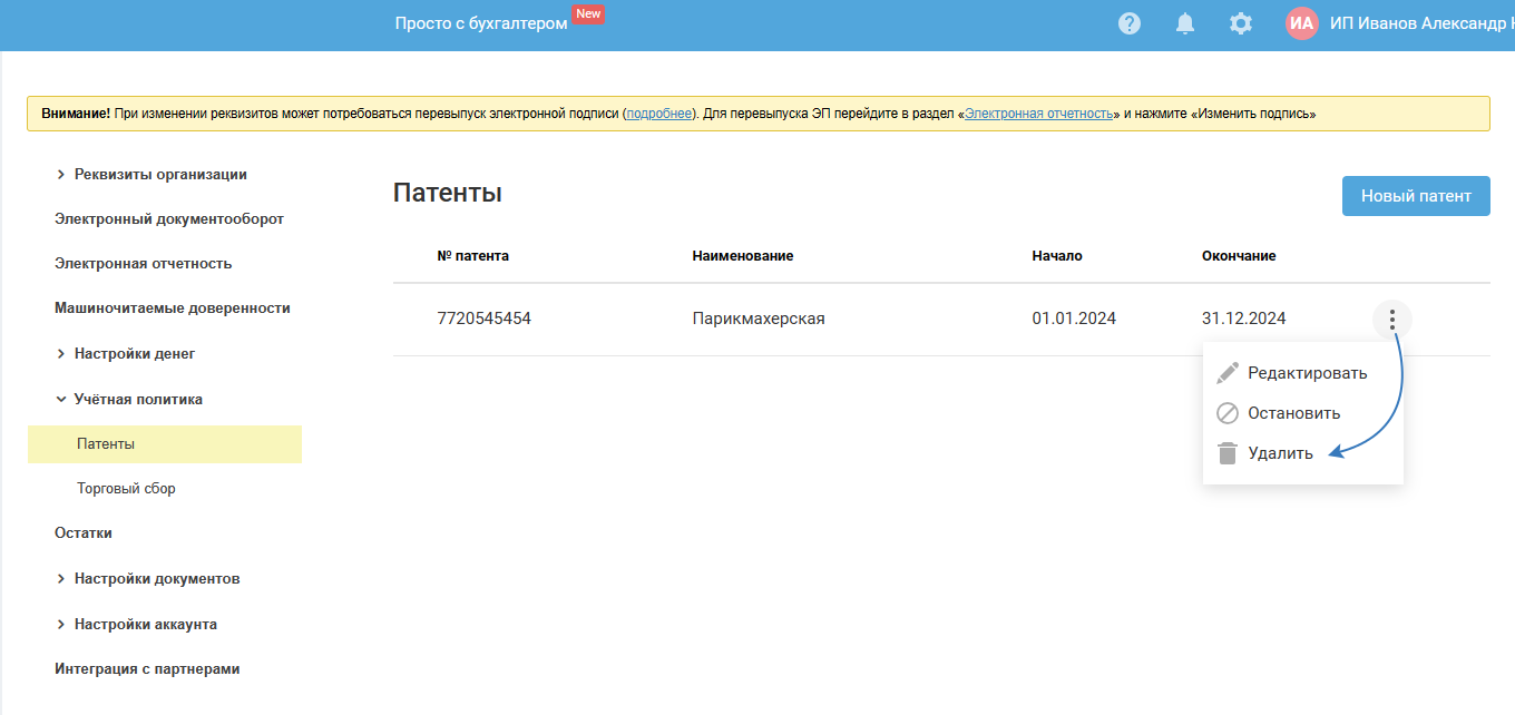 Удалить патент можно только в том случае, если с ним не связана ни одна операция в сервисе. После удаления всех связанных операций кнопка «Удалить» появится или станет активной: