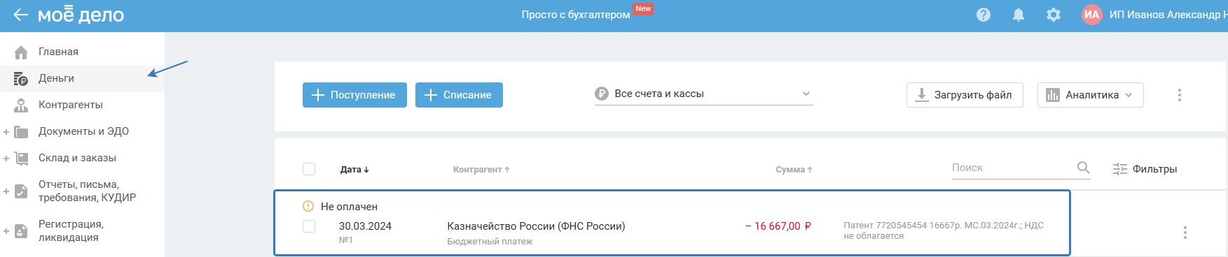 После завершения мастера в разделе «Деньги» сформируется платёжное поручение со статусом  «Не оплачено».