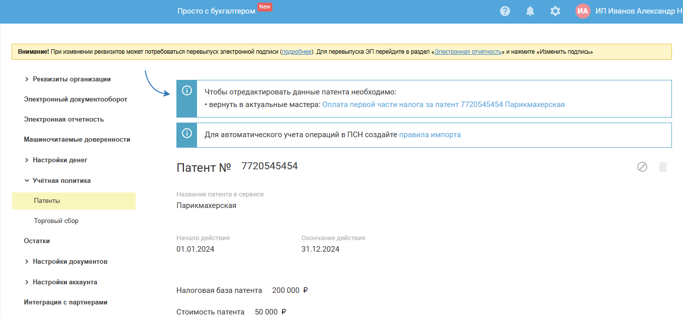На основании патента и образцов платёжных документов, которые вы получили от налоговой инспекции, заполните все поля в открывшейся карточке. Порядок следующий: