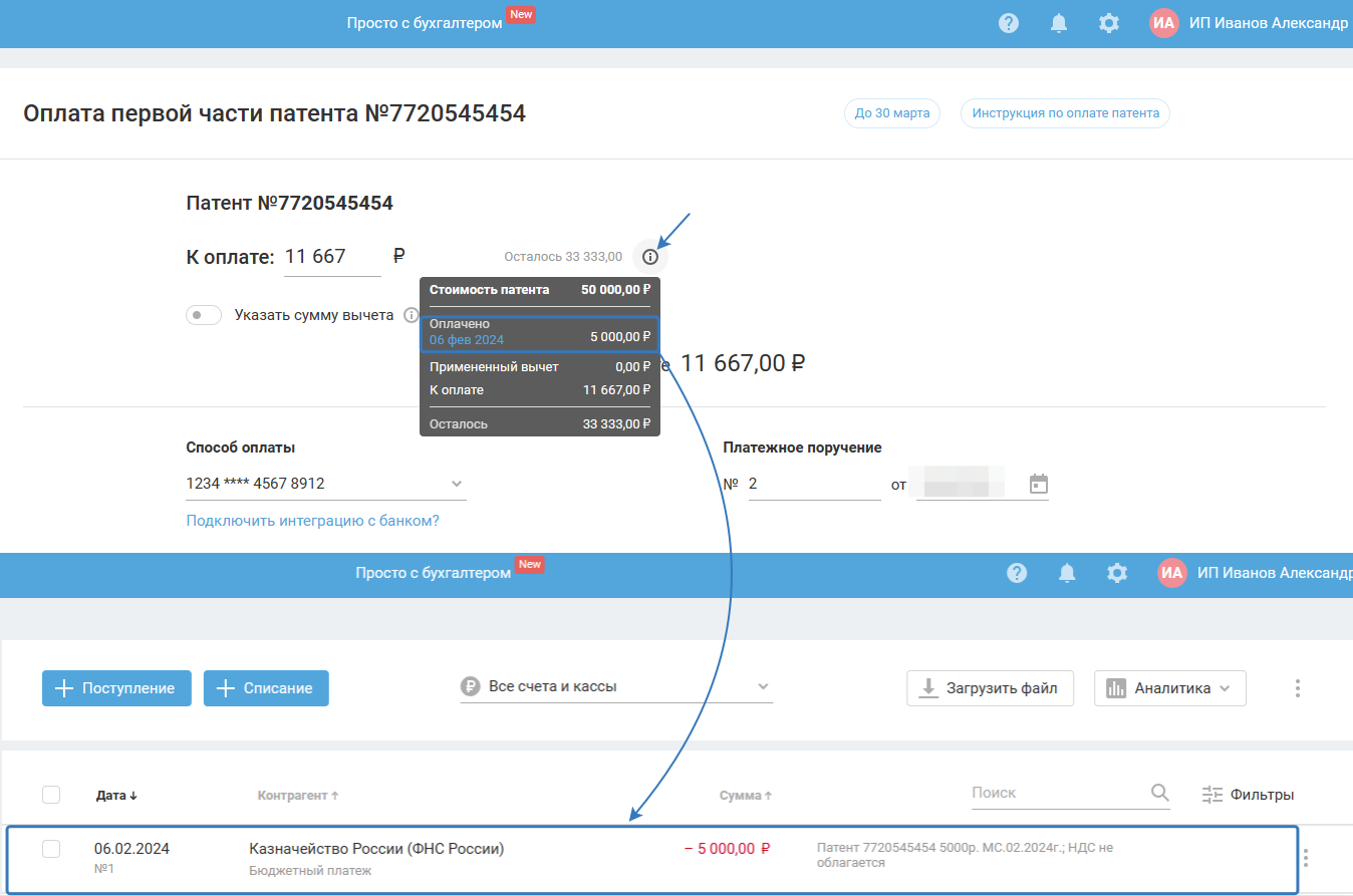 • в разделе Деньги есть связанные операции по патенту;